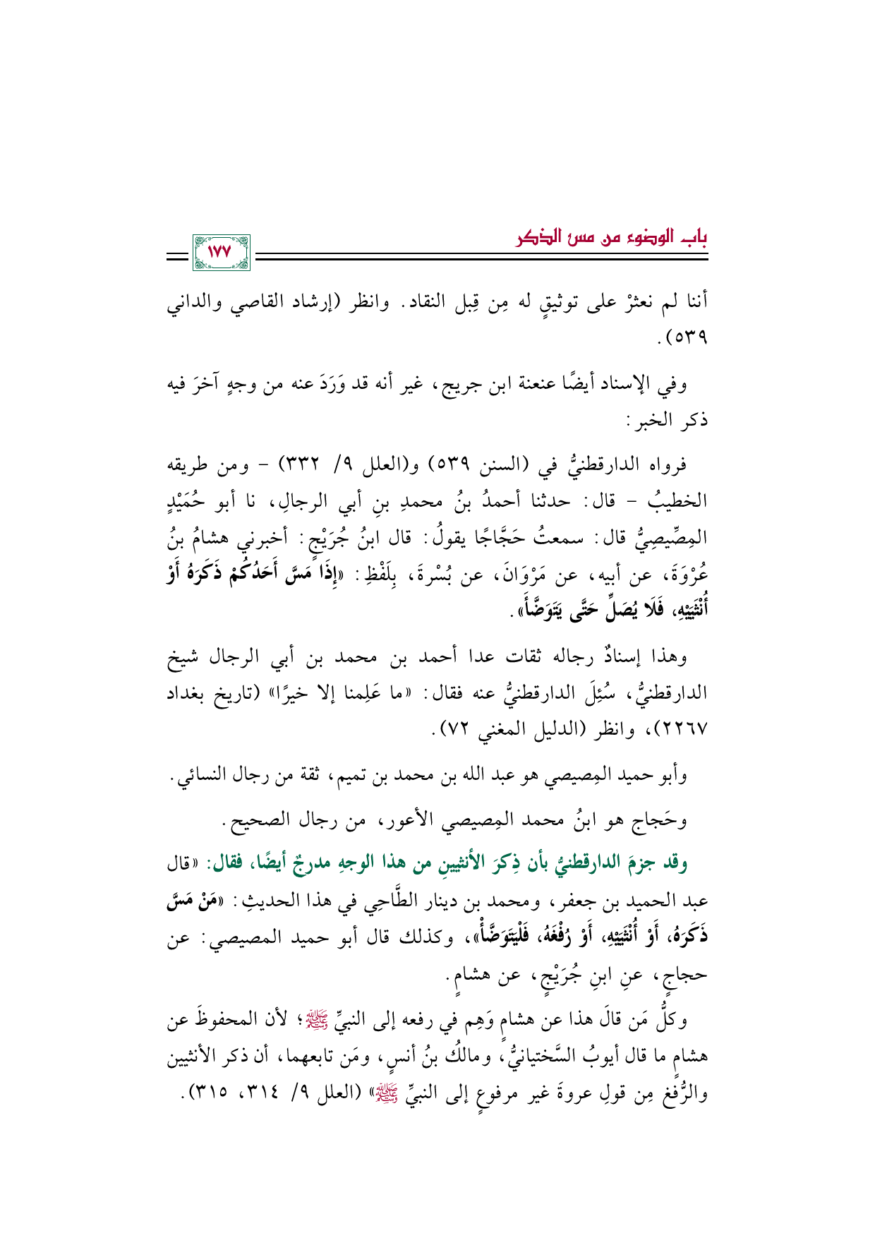 وقد جزمَ الدارقطنيُّ بأن ذِكرَ الأنثيينِ من هذا الوجهِ مدرجٌ أيضًا، فقال: ((قال عبد الحميد بن جعفر، ومحمد بن دينار الطَّاحِي في هذا الحديثِ: ((مَنْ مَسَّ ذَكَرَهُ، أَوْ أُنْثَيَيْهِ، أَوْ رُفْغَهُ، فَلْيَتَوَضَّأْ))، وكذلك قال أبو حميد المصيصي: عن حجاجٍ، عنِ ابنِ جُرَيْجٍ، عن هشامٍ.