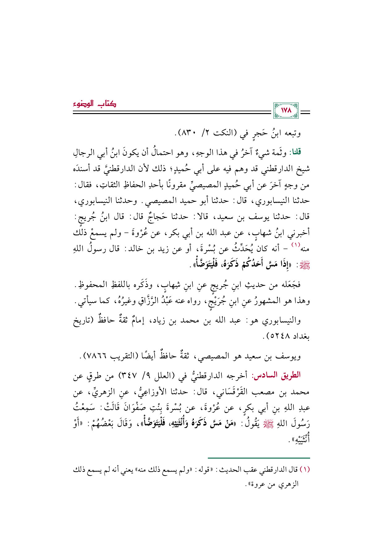 قلنا: وثَمة شيءٌ آخرُ في هذا الوجهِ، وهو احتمالُ أن يكونَ ابنُ أبي الرجالِ شيخ الدارقطني قد وهم فيه على أبي حُميدٍ؛ ذلك لأن الدارقطنيَّ قد أسندَه من وجهٍ آخرَ عن أبي حُميدٍ المصيصيِّ مقرونًا بأحدِ الحفاظِ الثقاتِ، فقال: حدثنا النيسابوري، قال: حدثنا أبو حميد المصيصي. وحدثنا النيسابوري، قال: حدثنا يوسف بن سعيد، قالا: حدثنا حَجاجٌ قال: قال ابنُ جُريجٍ: أخبرني ابنُ شهابٍ، عن عبد الله بن أبي بكر، عن عُرْوةَ -ولم يسمعْ ذلك منه (¬١) - أنه كان يُحَدِّثُ عن بُسْرةَ، أو عن زيد بن خالد: قال رسولُ اللهِ صلى الله عليه وسلم: ((إِذَا مَسَّ أَحَدُكُمْ ذَكَرَهُ، فَلْيَتَوَضَّأْ)).