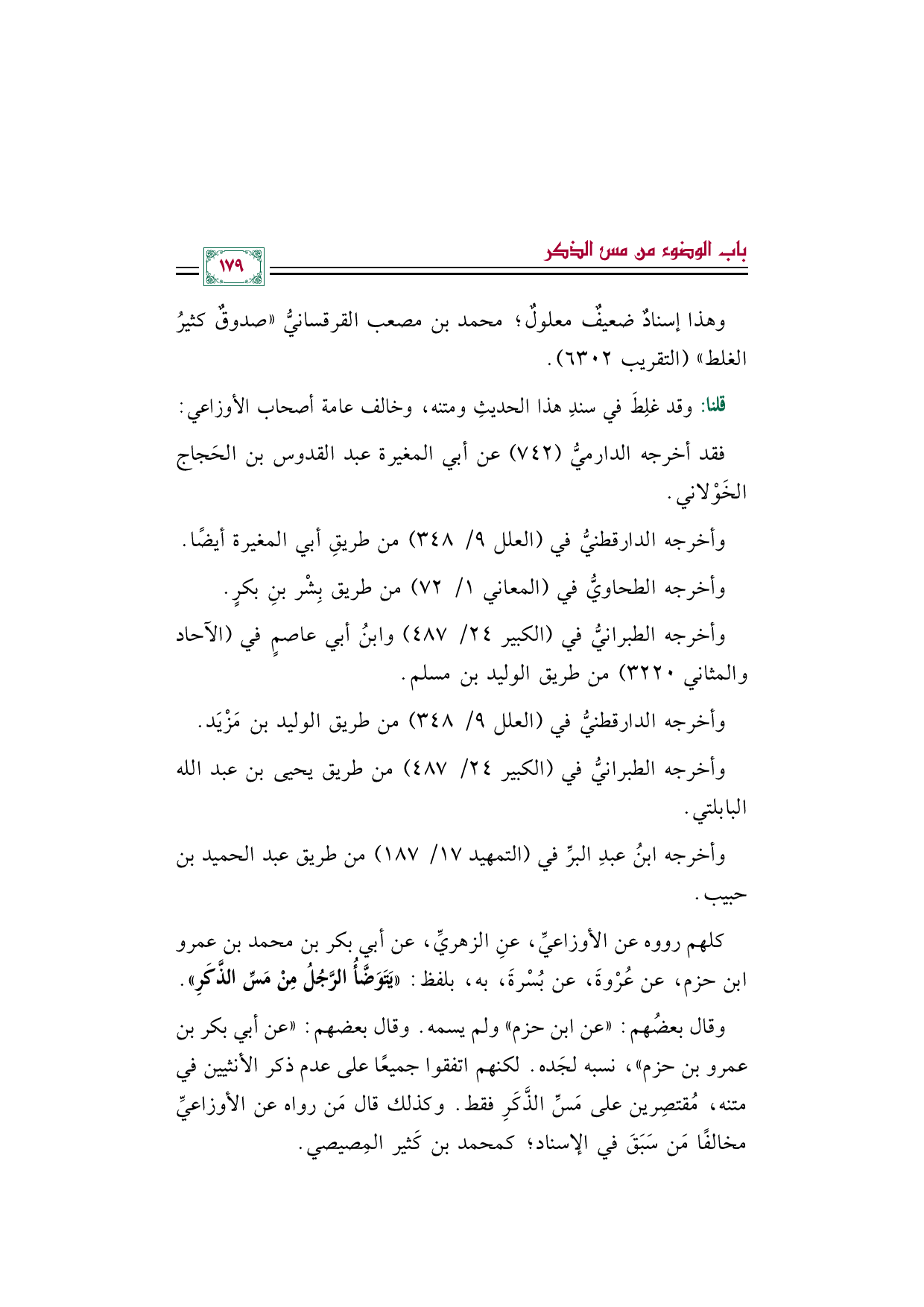 وقال بعضُهم: ((عن ابن حزم)) ولم يسمه. وقال بعضهم: ((عن أبي بكر بن عمرو بن حزم))، نسبه لجَده. لكنهم اتفقوا جميعًا على عدم ذكر الأنثيين في متنه، مُقتصِرين على مَسِّ الذَّكَرِ فقط. وكذلك قال مَن رواه عن الأوزاعيِّ مخالفًا مَن سَبَقَ في الإسناد؛ كمحمد بن كَثير المِصيصي.