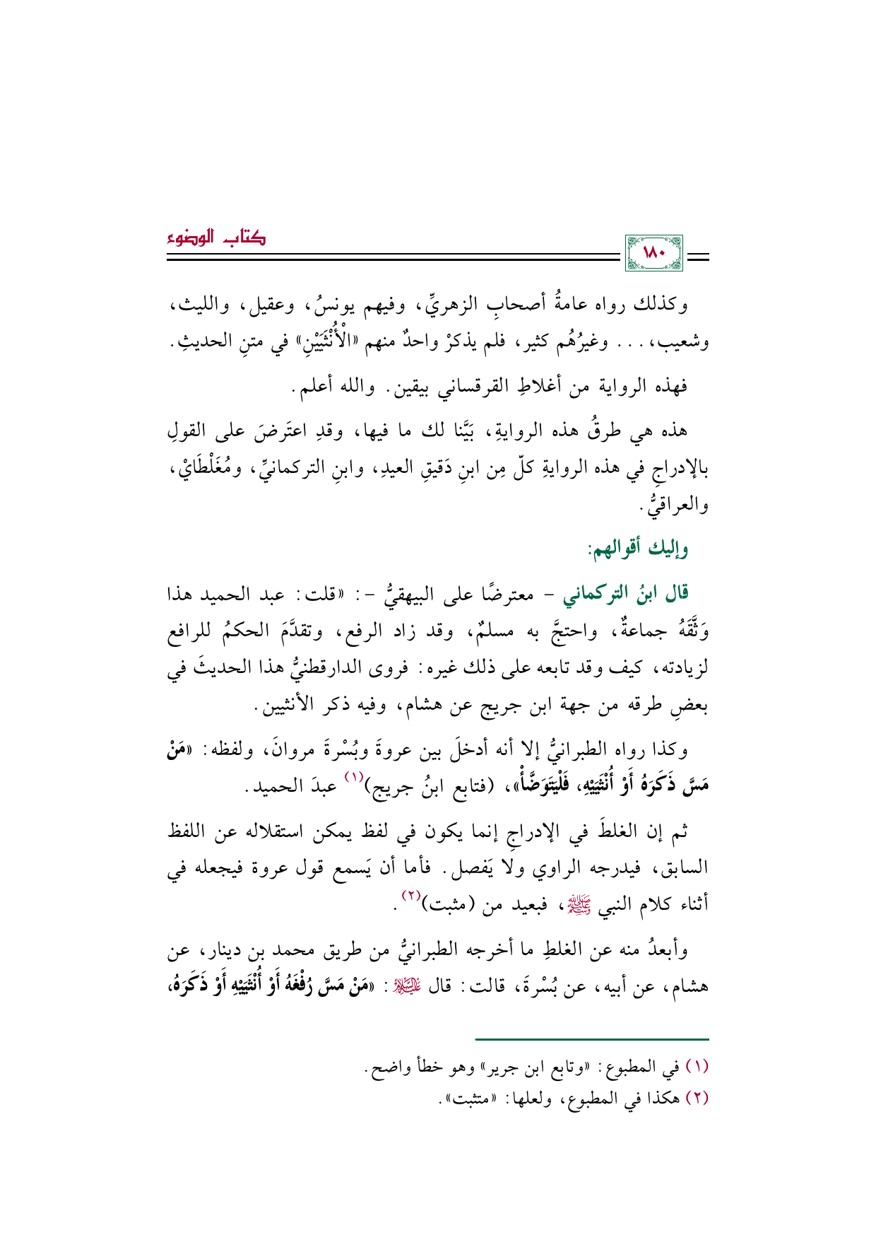 * قال ابنُ التركماني -معترضًا على البيهقيُّ-: ((قلت: عبد الحميد هذا وَثَّقَهُ جماعةٌ، واحتجَّ به مسلمٌ، وقد زاد الرفع، وتقدَّمَ الحكمُ للرافع لزيادته، كيف وقد تابعه على ذلك غيره: فروى الدارقطنيُّ هذا الحديثَ في بعضِ طرقه من جهة ابن جريج عن هشام، وفيه ذكر الأنثيين.