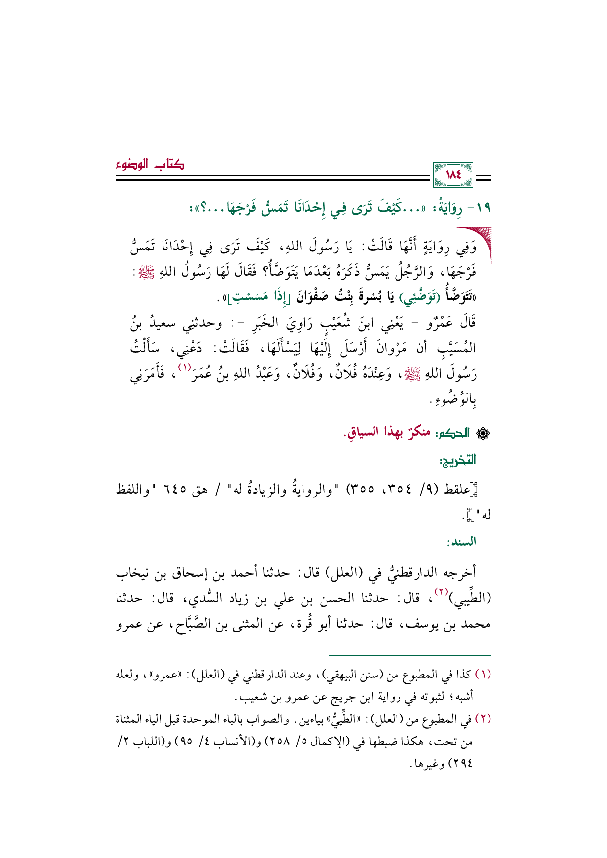 أخرجه الدارقطنيُّ في (العلل) قال: حدثنا أحمد بن إسحاق بن نيخاب (الطِّيبي) (¬٢)، قال: حدثنا الحسن بن علي بن زياد السُّدي، قال: حدثنا محمد بن يوسف، قال: حدثنا أبو قُرة، عن المثنى بن الصَّبَّاح، عن عمرو