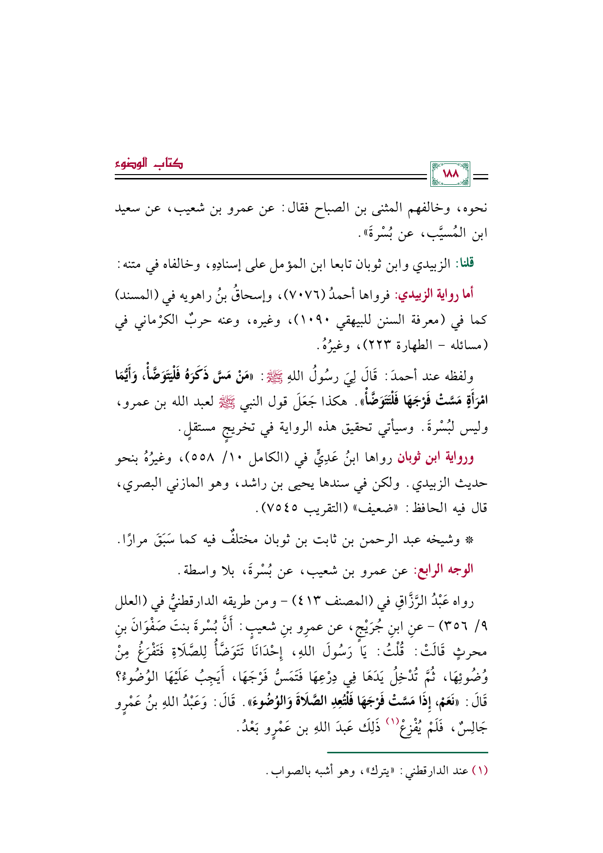 ولفظه عند أحمدَ: قَالَ لِيَ رسُولُ اللهِ صلى الله عليه وسلم: ((مَنْ مَسَّ ذَكَرَهُ فَلْيَتَوَضَّأْ، وَأَيُّمَا امْرَأَةٍ مَسَّتْ فَرْجَهَا فَلْتَتَوَضَّأْ)). هكذا جَعَلَ قول النبي صلى الله عليه وسلم لعبد الله بن عمرو، وليس لبُسْرةَ. وسيأتي تحقيق هذه الرواية في تخريجٍ مستقلٍ.
