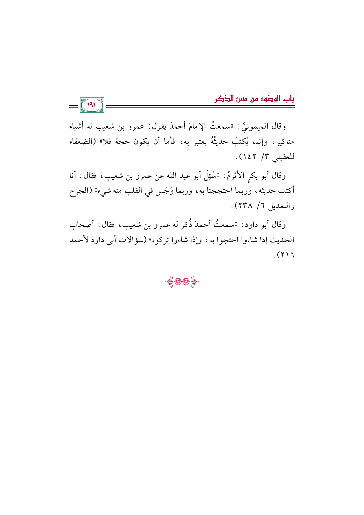 وقال الميمونيُّ: ((سمعتُ الإمامَ أحمدَ يقول: عمرو بن شعيب له أشياء مناكير، وإنما يُكتبُ حديثُهُ يعتبر به، فأما أن يكون حجة فلا)) (الضعفاء للعقيلي ٣/ ١٤٢).