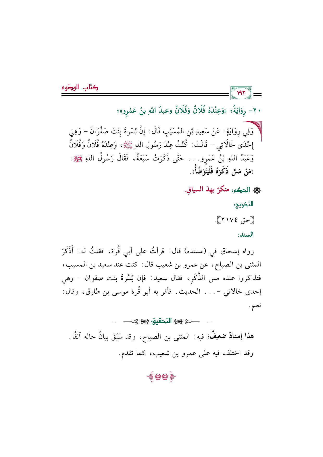 رواه إسحاق في (مسنده) قال: قرأتُ على أبي قُرة، فقلتُ له: أَذَكَرَ المثنى بن الصباح، عن عمرو بن شعيب قال: كنت عند سعيد بن المسيب، فتذاكروا عنده مس الذَّكَرِ، فقال سعيد: فإن بُسْرةَ بنت صفوان -وهي إحدى خالاتي- ... الحديث. فأقر به أبو قُرة موسى بن طارق، وقال: نعم.