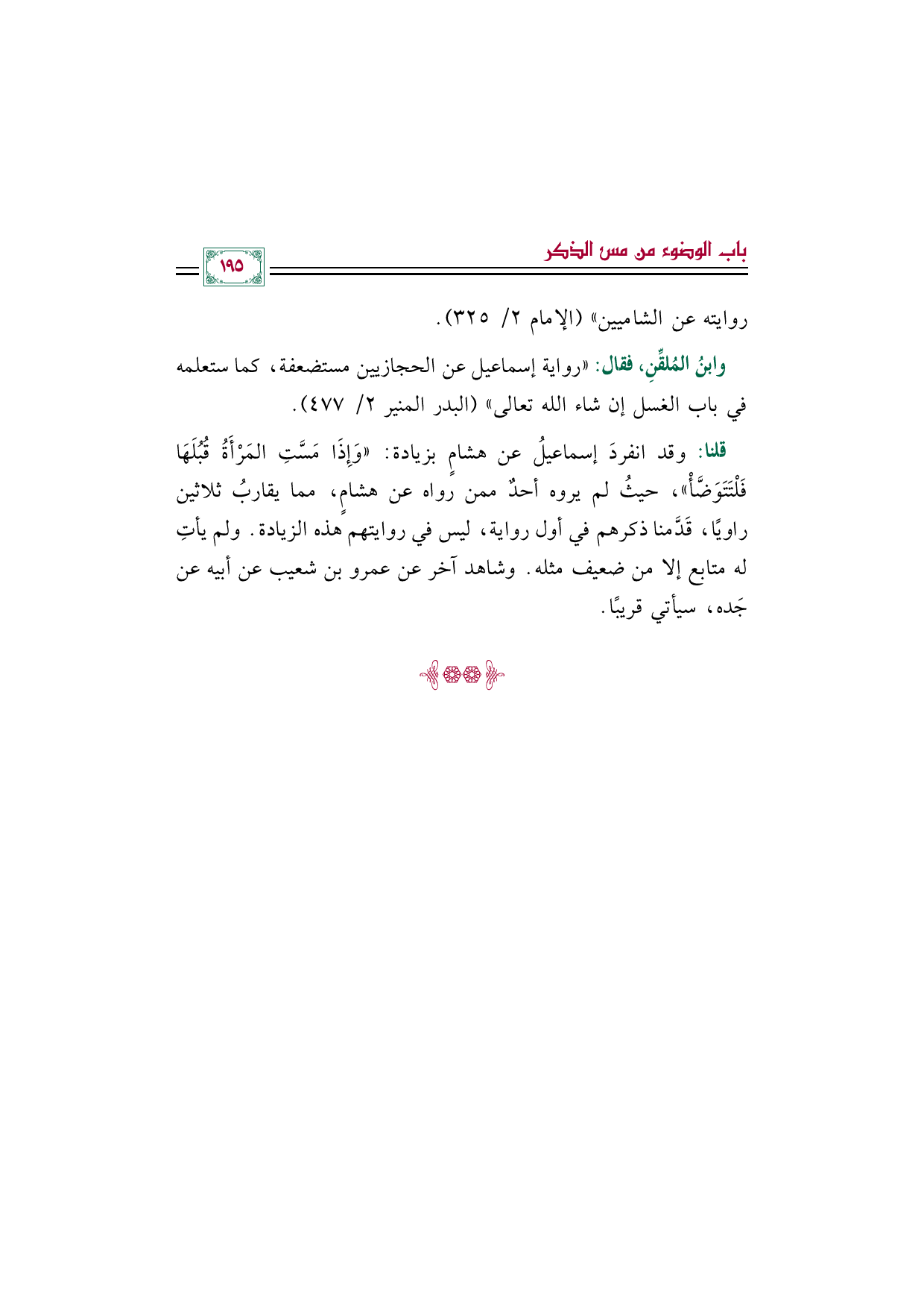 وابنُ المُلقِّنِ، فقال: ((رواية إسماعيل عن الحجازيين مستضعفة، كما ستعلمه في باب الغسل إن شاء الله تعالى)) (البدر المنير ٢/ ٤٧٧).