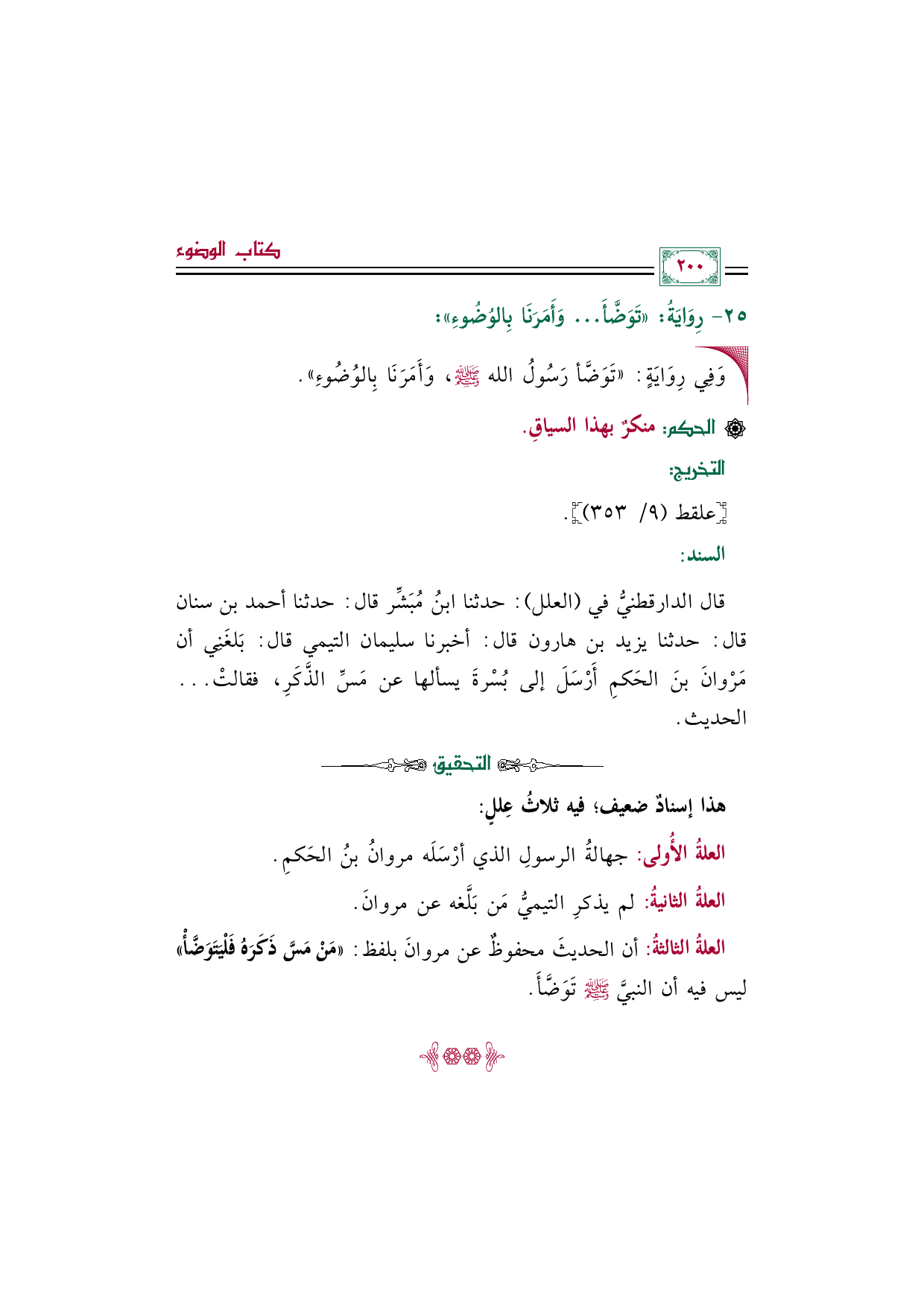 العلةُ الثالثةُ: أن الحديثَ محفوظٌ عن مروانَ بلفظ: ((مَنْ مَسَّ ذَكَرَهُ فَلْيَتَوَضَّأْ)) ليس فيه أن النبيَّ صلى الله عليه وسلم تَوَضَّأَ.