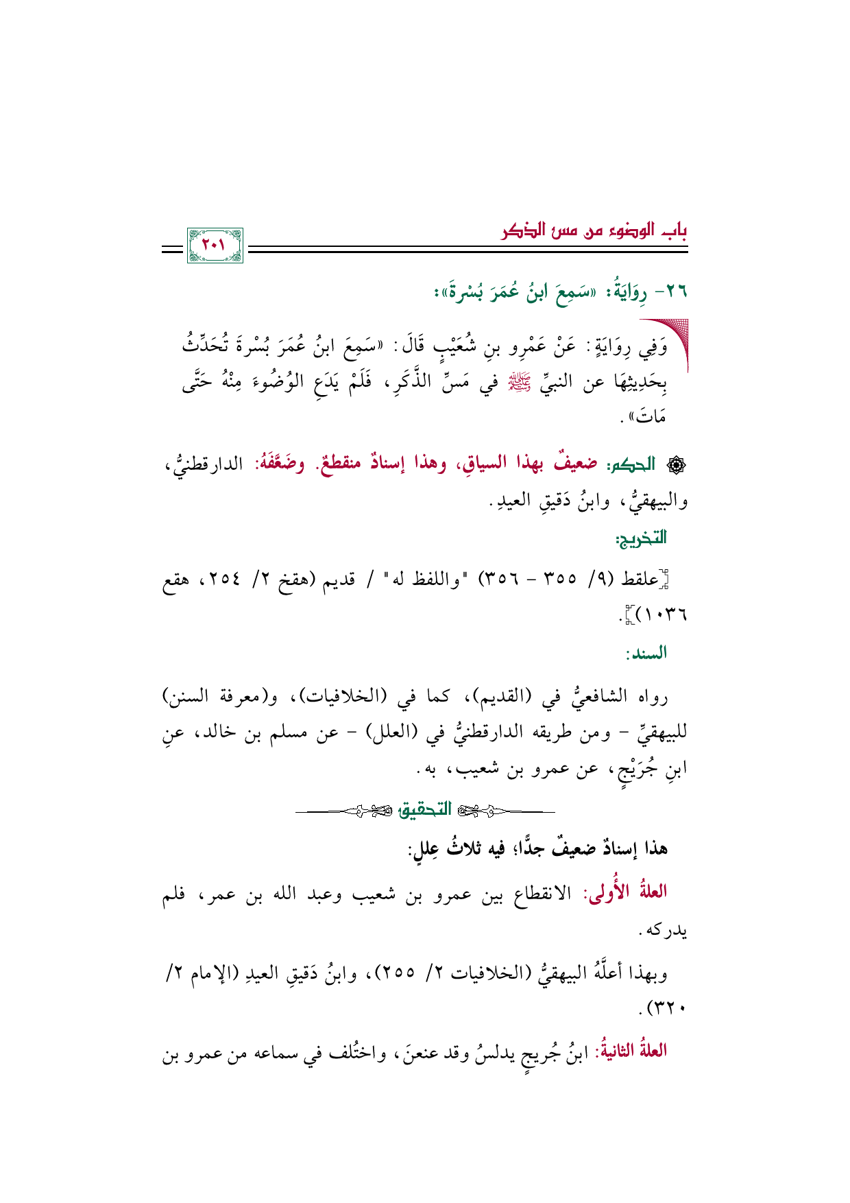 العلةُ الأُولى: الانقطاع بين عمرو بن شعيب وعبد الله بن عمر، فلم يدركه.