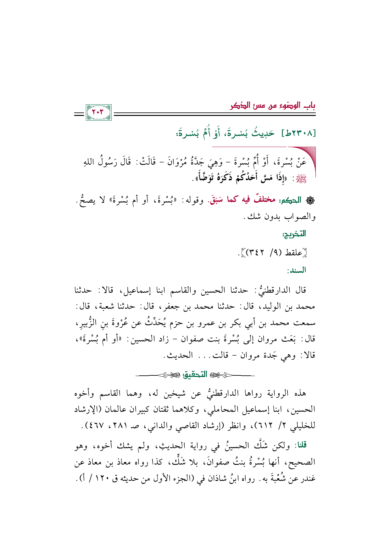 قال الدارقطنيُّ: حدثنا الحسين والقاسم ابنا إسماعيل، قالا: حدثنا محمد بن الوليد، قال: حدثنا محمد بن جعفر، قال: حدثنا شعبة، قال: سمعت محمد بن أبي بكر بن عمرو بن حزم يُحَدِّثُ عن عُرْوةَ بنِ الزُّبيرِ، قال: بَعَث مروان إلى بُسْرةَ بنت صفوان- زاد الحسين: ((أو أم بُسْرةَ))، قالا: وهي جَدة مروان- قالت ... الحديث.
