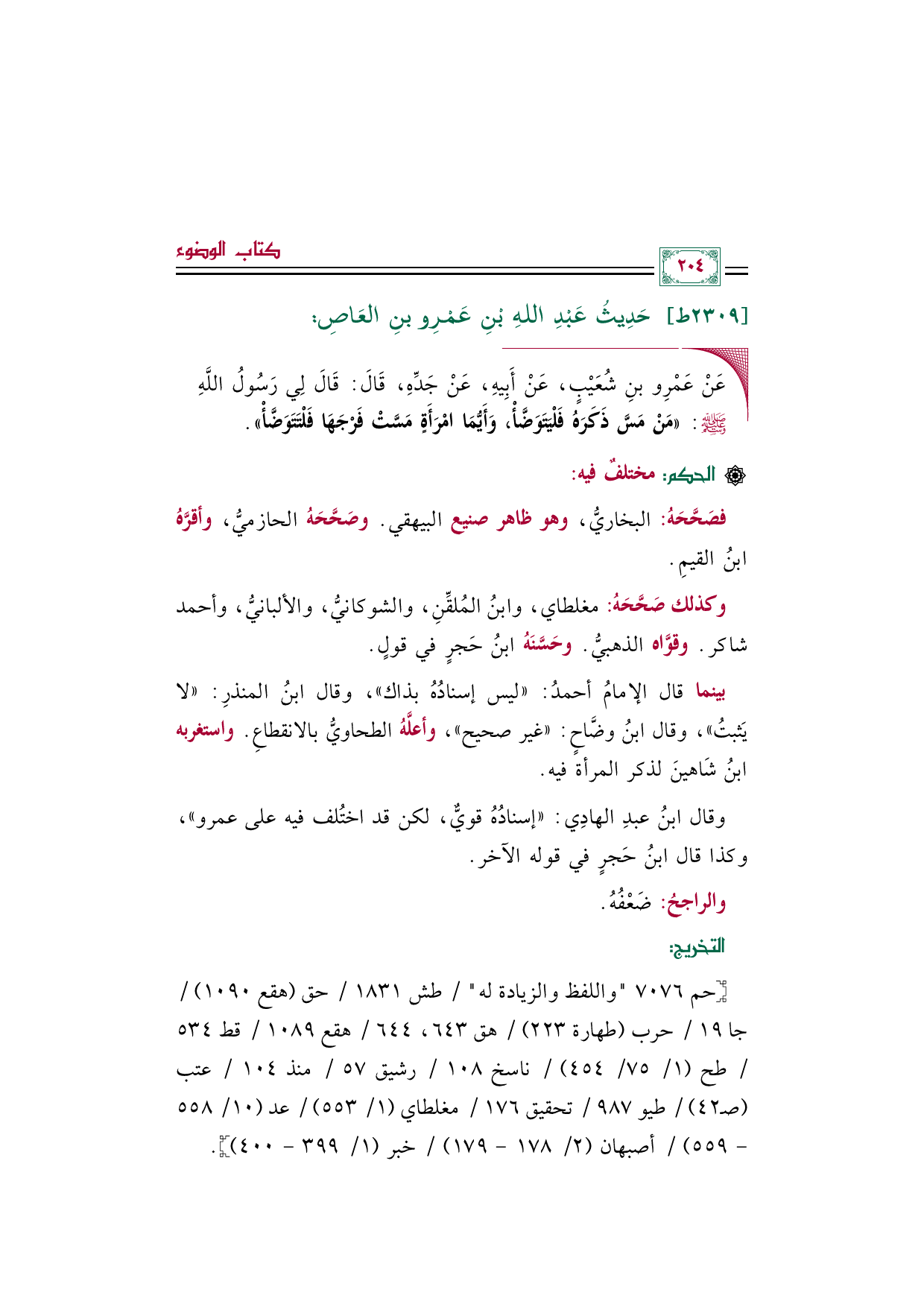 ◼ عَنْ عَمْرِو بنِ شُعَيْبٍ، عَنْ أَبِيهِ، عَنْ جَدِّهِ، قَالَ: قَالَ لِي رَسُولُ اللَّهِ صلى الله عليه وسلم: ((مَنْ مَسَّ ذَكَرَهُ فَلْيَتَوَضَّأْ، وَأَيُّمَا امْرَأَةٍ مَسَّتْ فَرْجَهَا فَلْتَتَوَضَّأْ)).