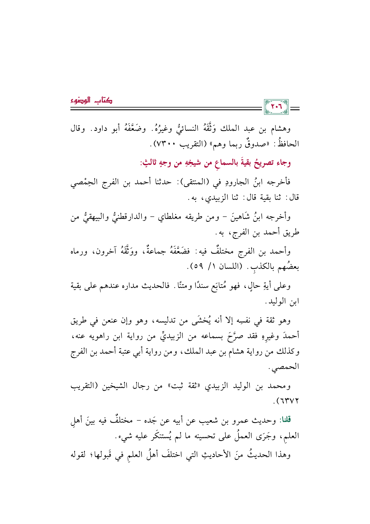 وعلى أيةِ حالٍ، فهو مُتابَع سندًا ومتنًا. فالحديث مداره عندهم على بقية بن الوليد.