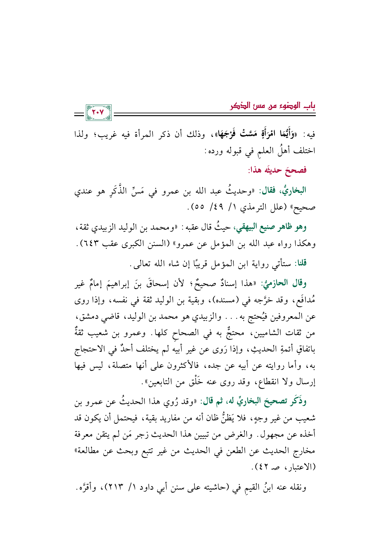 البخاريُّ، فقال: ((وحديثُ عبد الله بن عمرو في مَسِّ الذَّكَرِ هو عندي صحيح)) (علل الترمذي ١/ ٤٩/ ٥٥).
