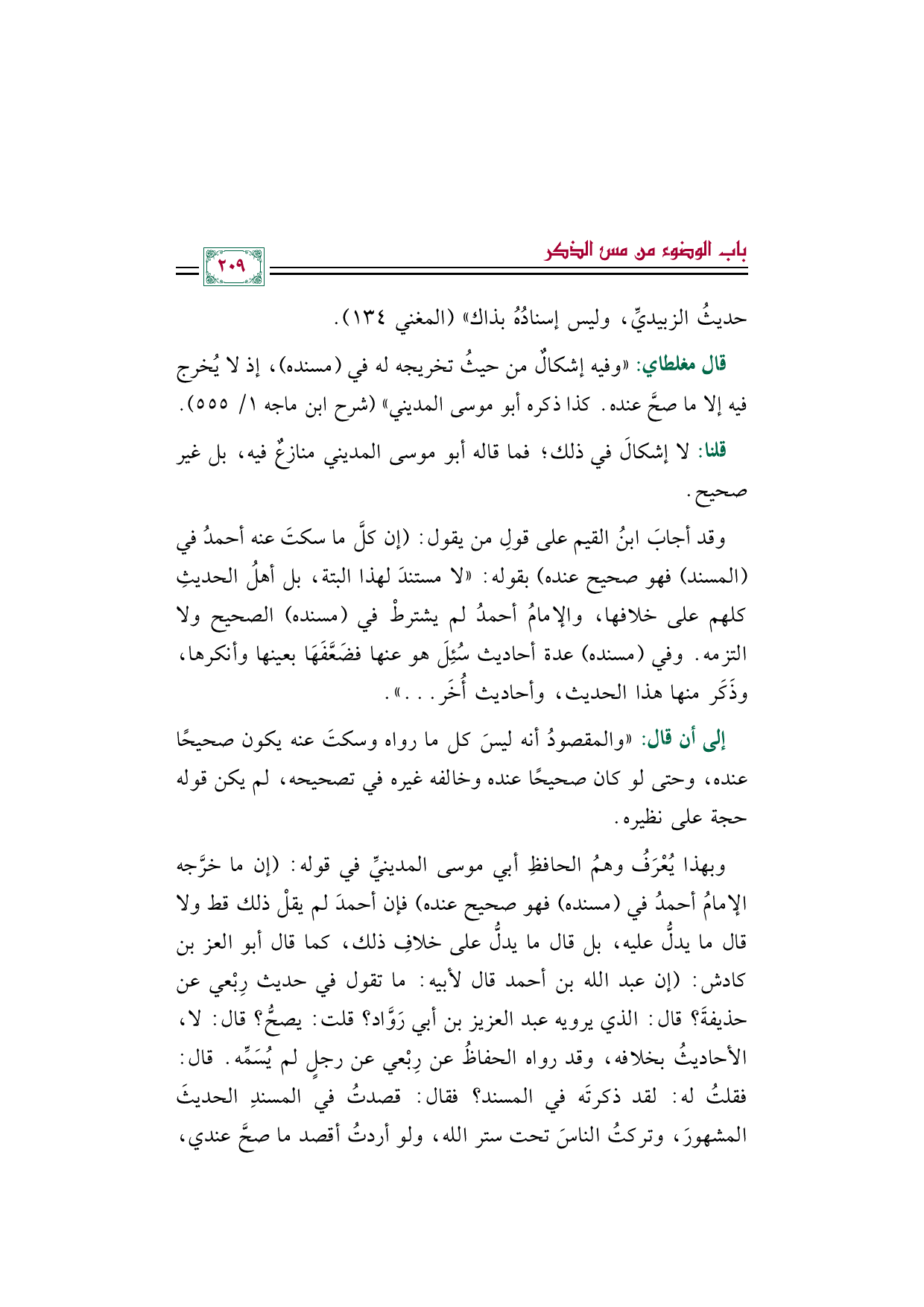 وبهذا يُعْرَفُ وهمُ الحافظِ أبي موسى المدينيِّ في قوله: (إن ما خرَّجه الإمامُ أحمدُ في (مسنده) فهو صحيح عنده) فإن أحمدَ لم يقلْ ذلك قط ولا قال ما يدلُّ عليه، بل قال ما يدلُّ على خلافِ ذلك، كما قال أبو العز بن كادش: (إن عبد الله بن أحمد قال لأبيه: ما تقول في حديث رِبْعي عن حذيفةَ؟ قال: الذي يرويه عبد العزيز بن أبي رَوَّاد؟ قلت: يصحُّ؟ قال: لا، الأحاديثُ بخلافه، وقد رواه الحفاظُ عن رِبْعي عن رجلٍ لم يُسَمِّه. قال: فقلتُ له: لقد ذكرتَه في المسند؟ فقال: قصدتُ في المسندِ الحديثَ المشهورَ، وتركتُ الناسَ تحت ستر الله، ولو أردتُ أقصد ما صحَّ عندي،