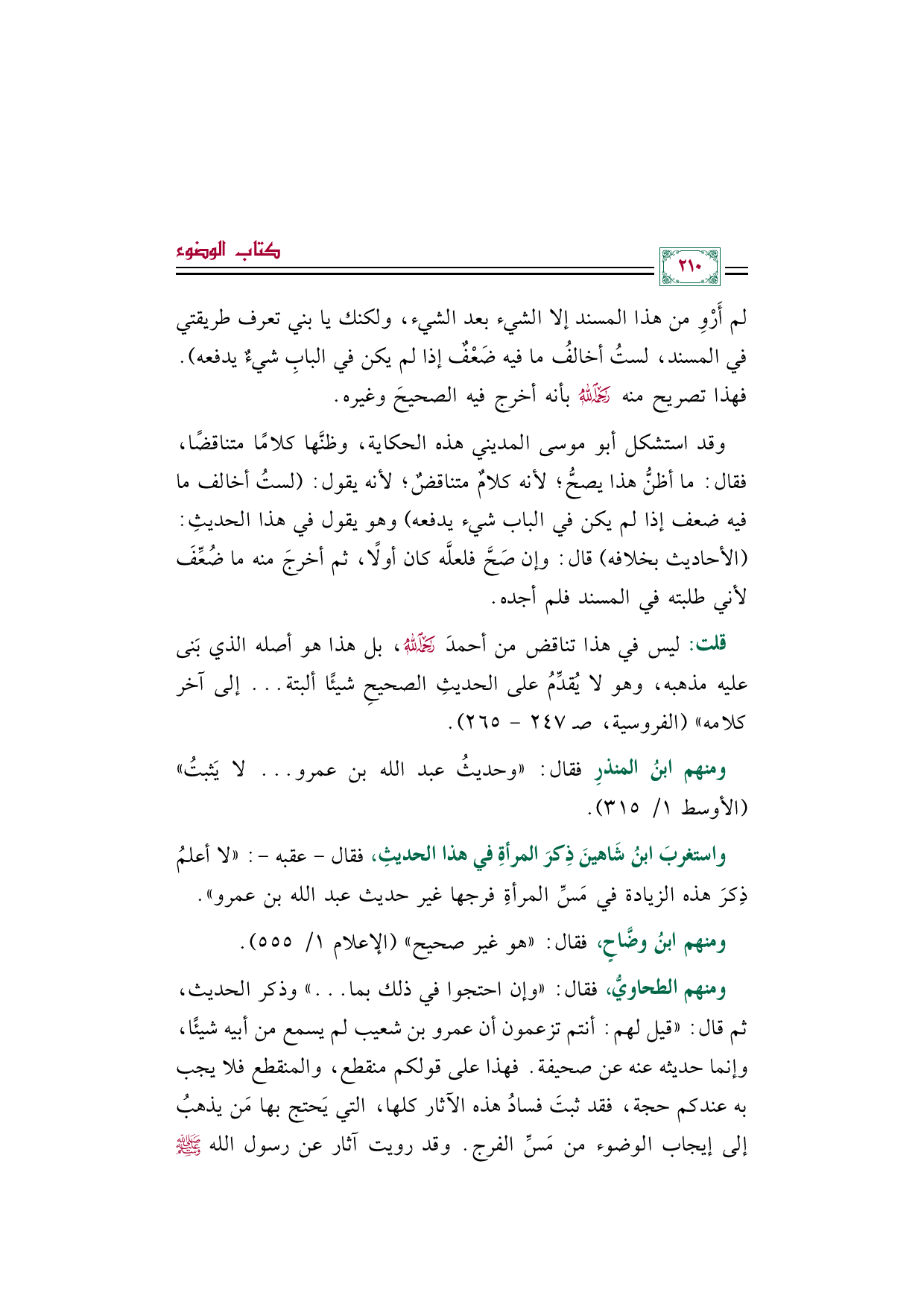 * ومنهم الطحاويُّ، فقال: ((وإن احتجوا في ذلك بما ... )) وذكر الحديث، ثم قال: ((قيل لهم: أنتم تزعمون أن عمرو بن شعيب لم يسمع من أبيه شيئًا، وإنما حديثه عنه عن صحيفة. فهذا على قولكم منقطع، والمنقطع فلا يجب به عندكم حجة، فقد ثبتَ فسادُ هذه الآثار كلها، التي يَحتج بها مَن يذهبُ إلى إيجاب الوضوء من مَسِّ الفرج. وقد رويت آثار عن رسول الله صلى الله عليه وسلم