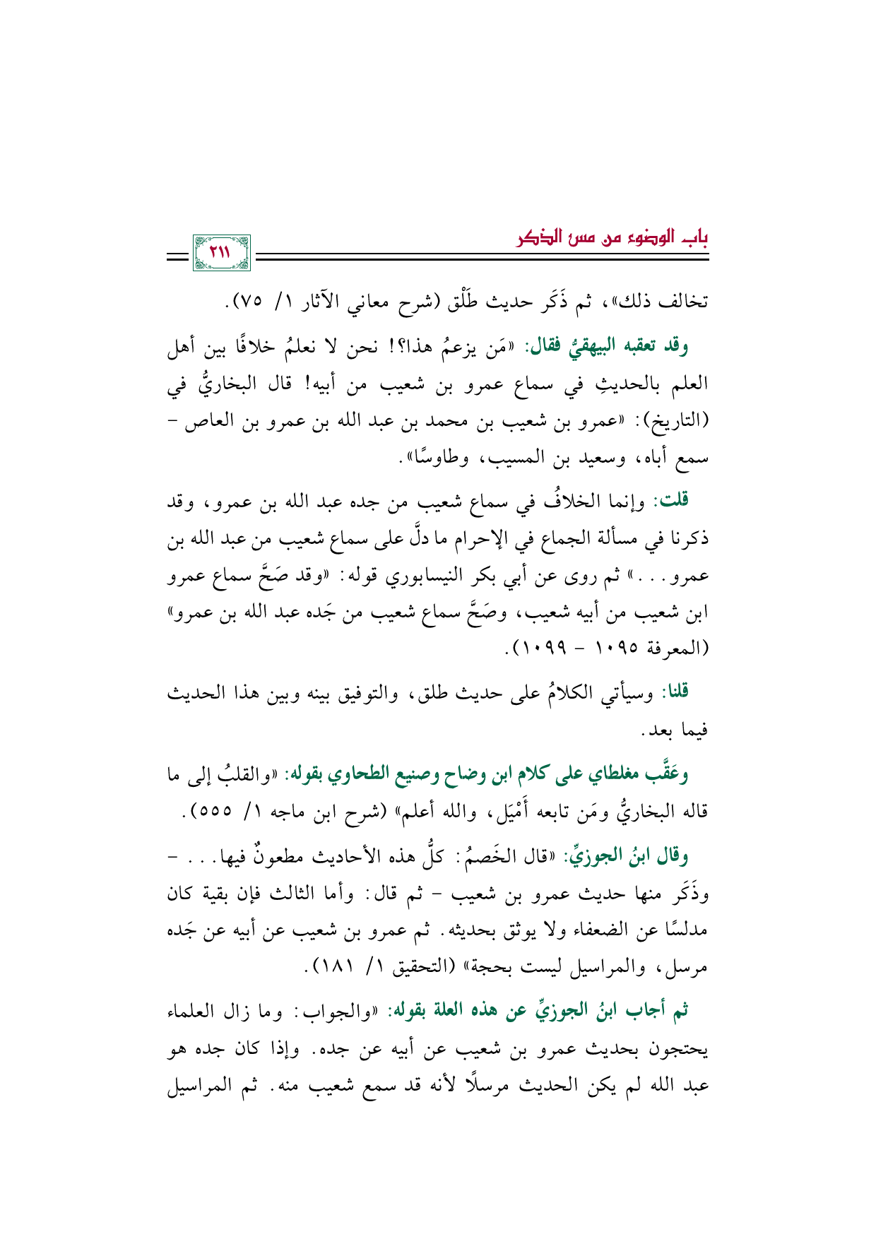 وقد تعقبه البيهقيُّ فقال: ((مَن يزعمُ هذا؟ ! نحن لا نعلمُ خلافًا بين أهل العلم بالحديثِ في سماع عمرو بن شعيب من أبيه! قال البخاريُّ في (التاريخ): "عمرو بن شعيب بن محمد بن عبد الله بن عمرو بن العاص- سمع أباه، وسعيد بن المسيب، وطاوسًا".