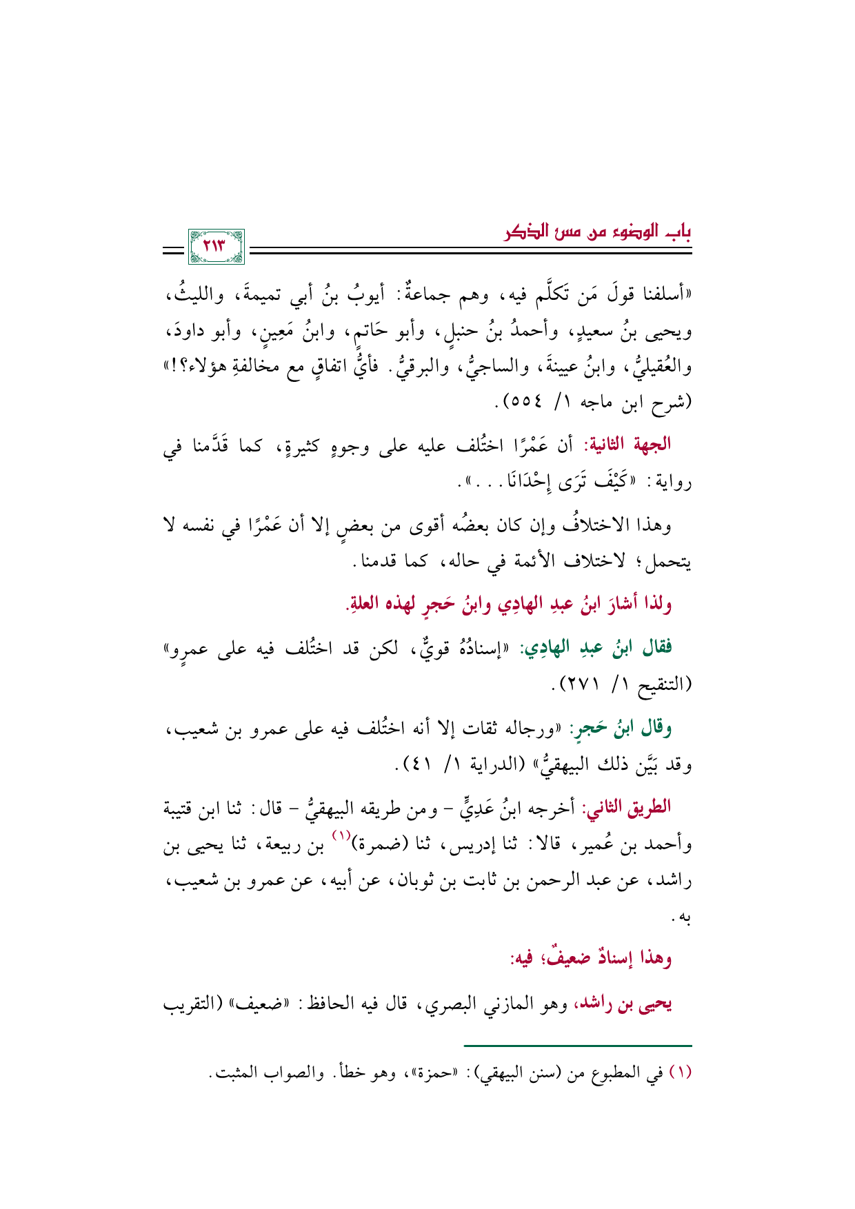 فقال ابنُ عبدِ الهادِي: ((إسنادُهُ قويٌّ، لكن قد اختُلف فيه على عمرٍو)) (التنقيح ١/ ٢٧١).