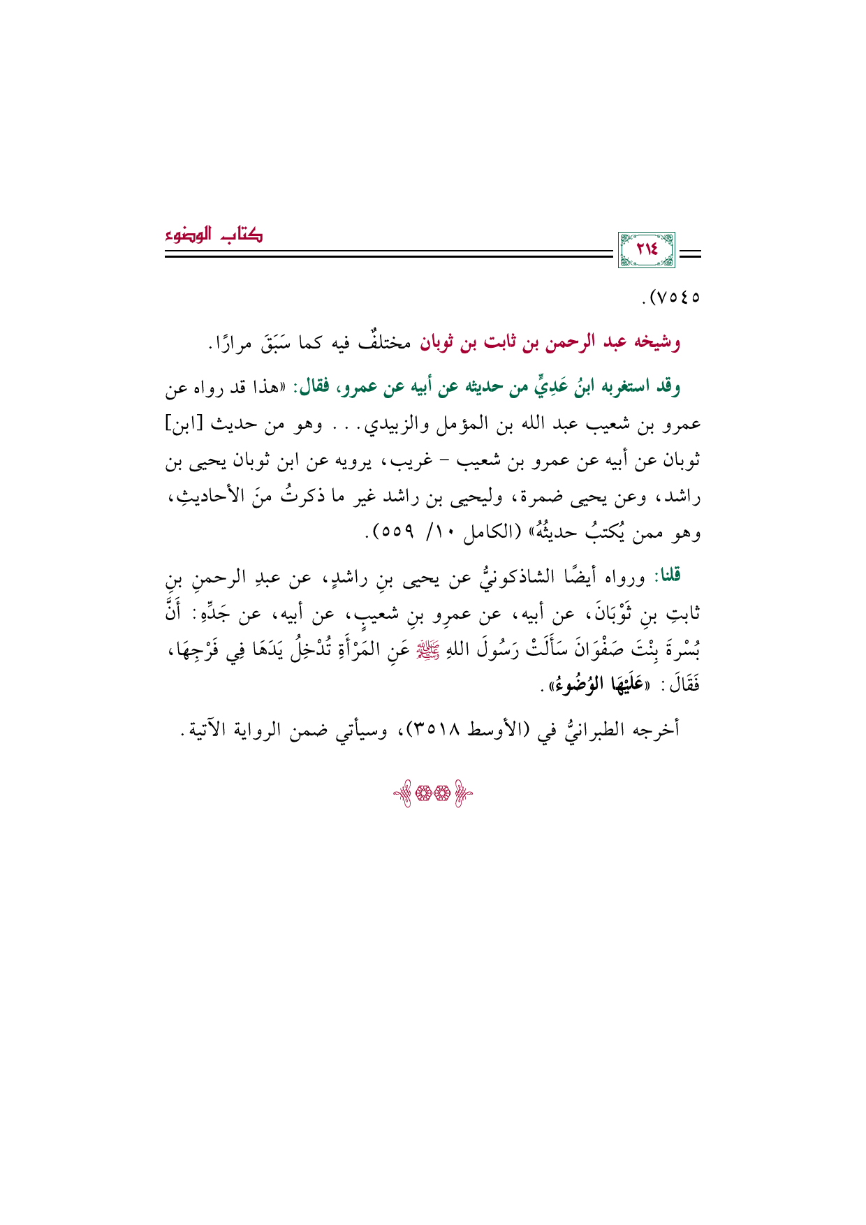 قلنا: ورواه أيضًا الشاذكونيُّ عن يحيى بنِ راشدٍ، عن عبدِ الرحمنِ بنِ ثابتِ بنِ ثَوْبَانَ، عن أبيه، عن عمرِو بنِ شعيبٍ، عن أبيه، عن جَدِّهِ: أَنَّ بُسْرةَ بِنْتَ صَفْوَانَ سَأَلَتْ رَسُولَ اللهِ صلى الله عليه وسلم عَنِ المَرْأَةِ تُدْخِلُ يَدَهَا فِي فَرْجِهَا، فَقَالَ: ((عَلَيْهَا الوُضُوءُ)).
