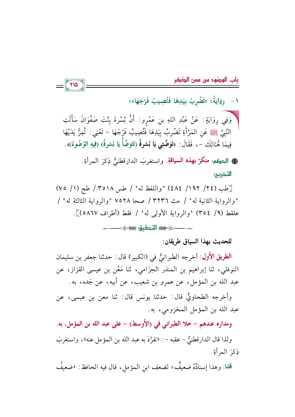 ولذا قال الدارقطنيُّ -عقبه-: ((تفرَّدَ به عبد الله بن المؤمل عنه))، واستغربَ ذِكرَ المرأةِ.