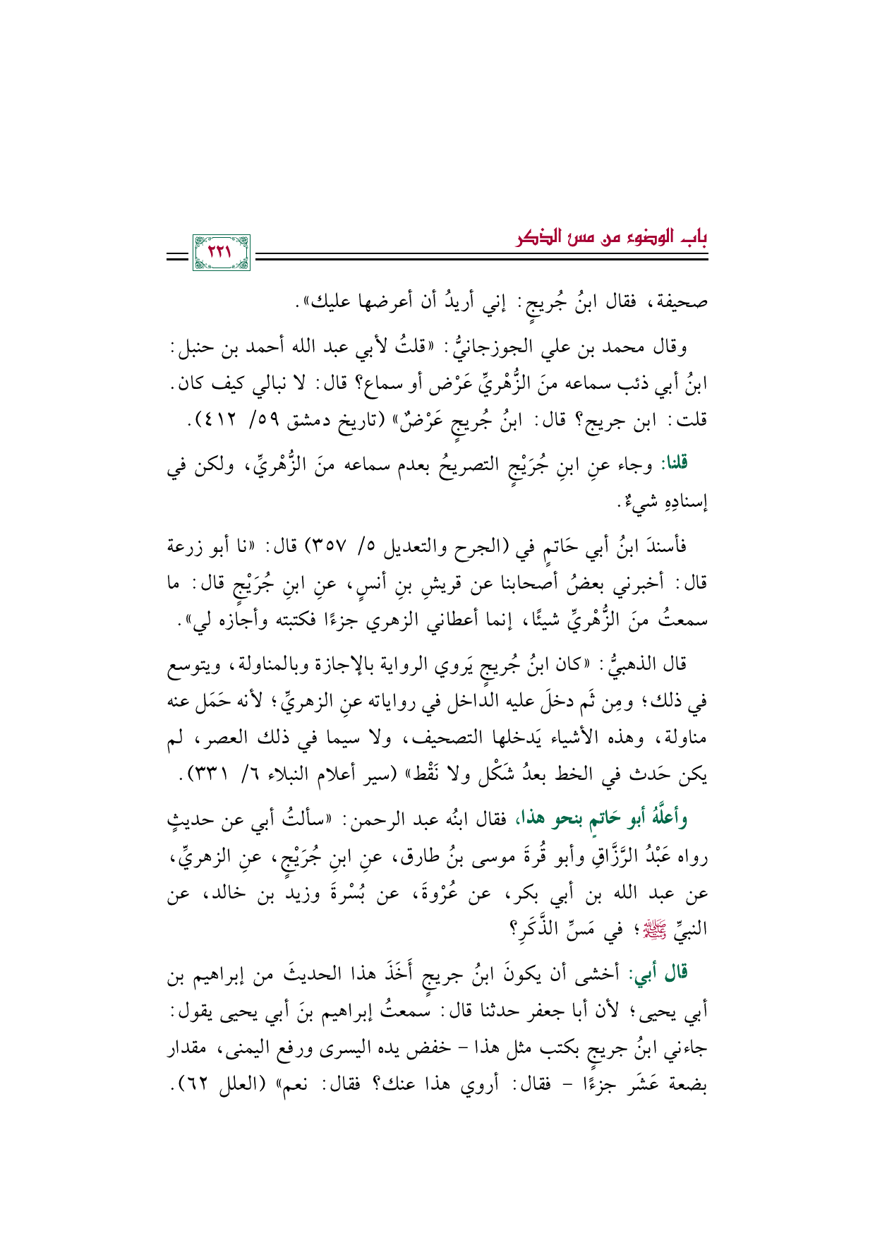 وأعلَّهُ أبو حَاتمٍ بنحو هذا، فقال ابنُه عبد الرحمن: ((سألتُ أبي عن حديثٍ رواه عَبْدُ الرَّزَّاقِ وأبو قُرةَ موسى بنُ طارق، عنِ ابنِ جُرَيْجٍ، عنِ الزهريِّ، عن عبد الله بن أبي بكر، عن عُرْوةَ، عن بُسْرةَ وزيد بن خالد، عن النبيِّ صلى الله عليه وسلم؛ في مَسِّ الذَّكَرِ؟