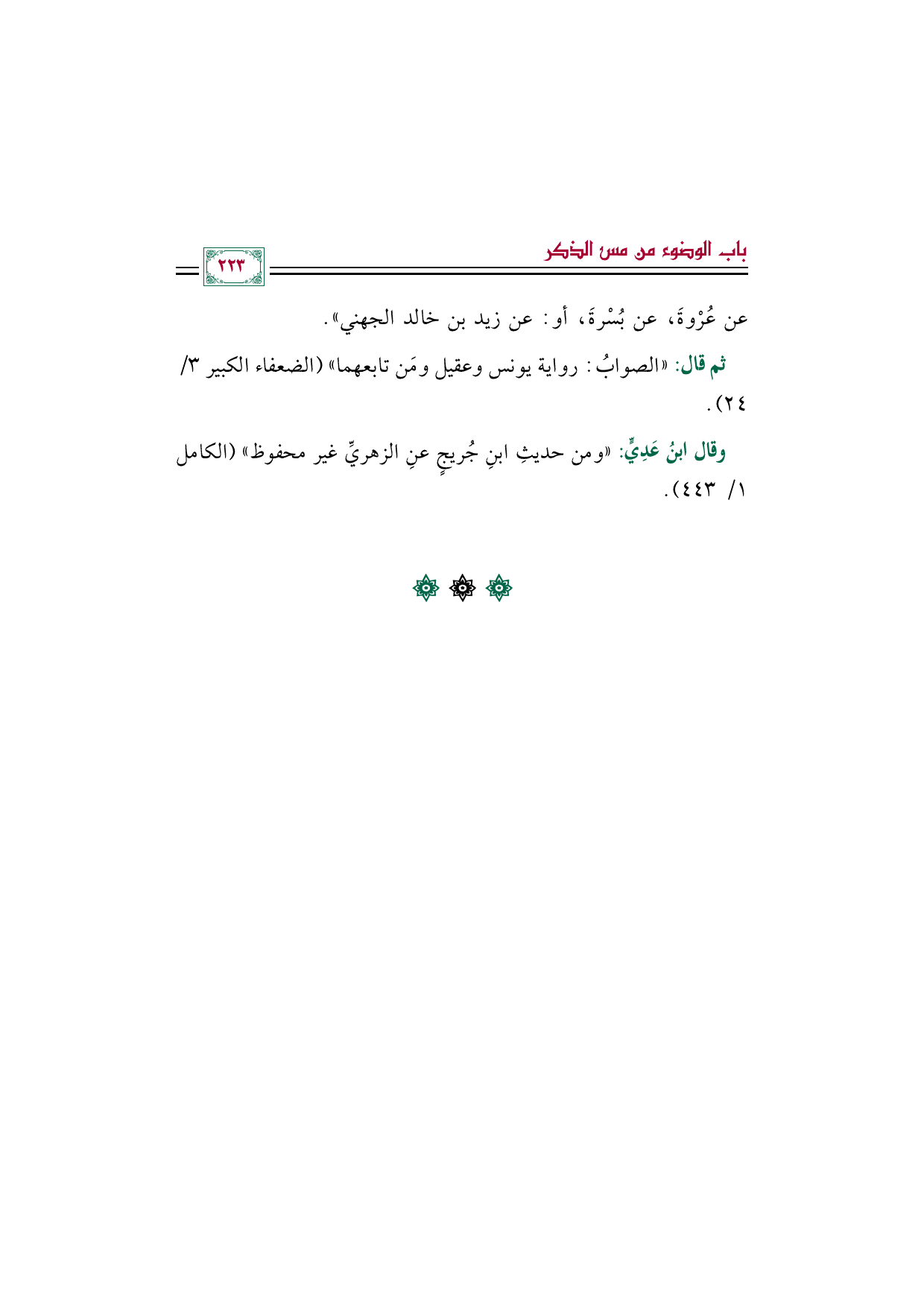 عن عُرْوةَ، عن بُسْرةَ، أو: عن زيد بن خالد الجهني)).