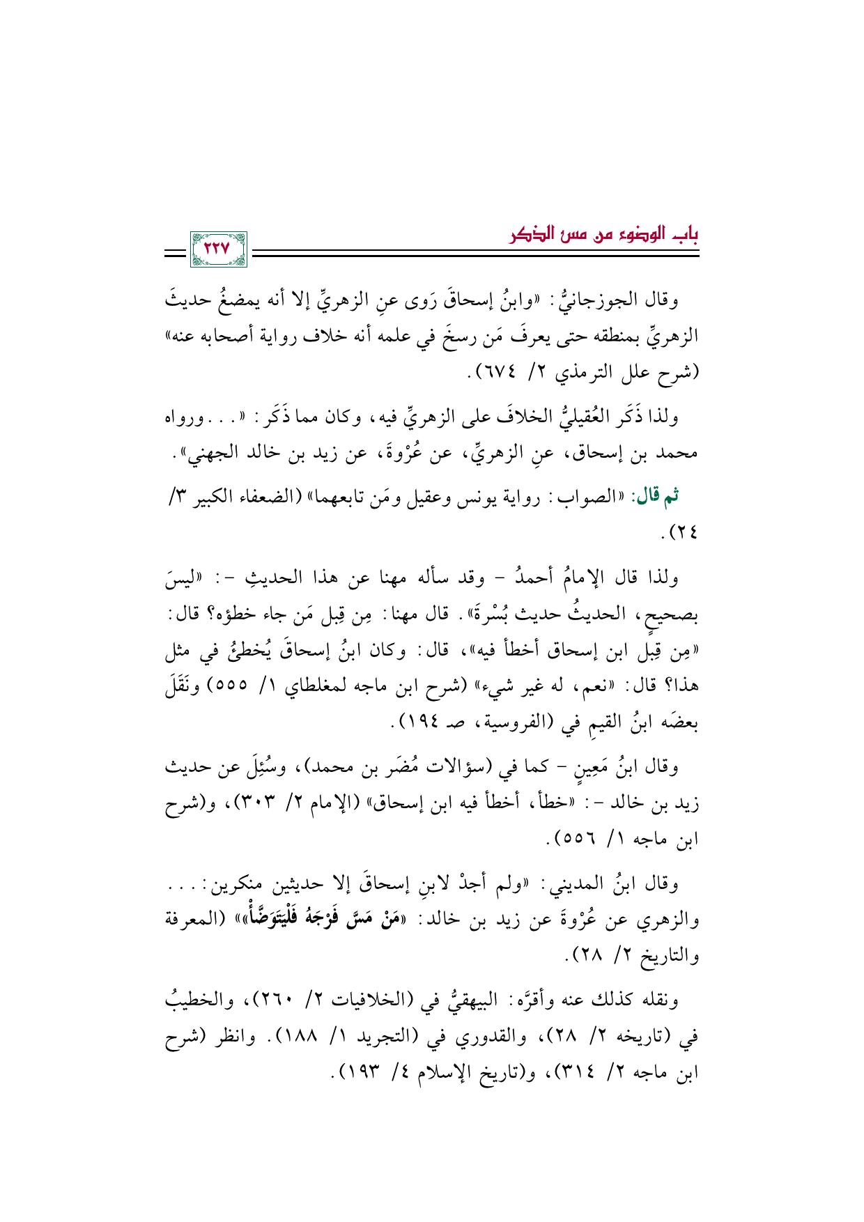 وقال ابنُ المديني: ((ولم أجدْ لابنِ إسحاقَ إلا حديثين منكرين: ... والزهري عن عُرْوةَ عن زيد بن خالد: ((مَنْ مَسَّ فَرْجَهُ فَلْيَتَوَضَّأْ))) (المعرفة والتاريخ ٢/ ٢٨).