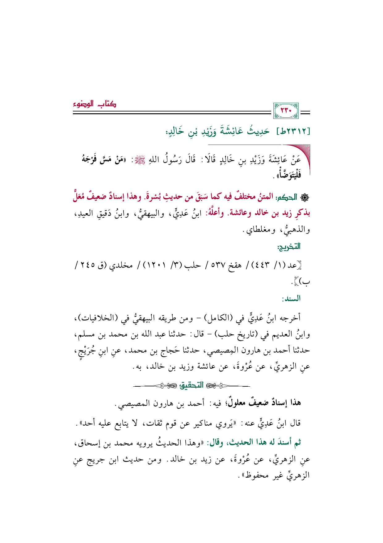 [الحكم]: المتنُ مختلفٌ فيه كما سَبَقَ من حديثِ بُسْرةَ. وهذا إسنادٌ ضعيفٌ مُعَلٌّ بذكرِ زيد بن خالد وعائشة. وأعلَّهُ: ابنُ عَدِيٍّ، والبيهقيُّ، وابنُ دَقيقِ العيدِ، والذهبيُّ، ومغلطاي.