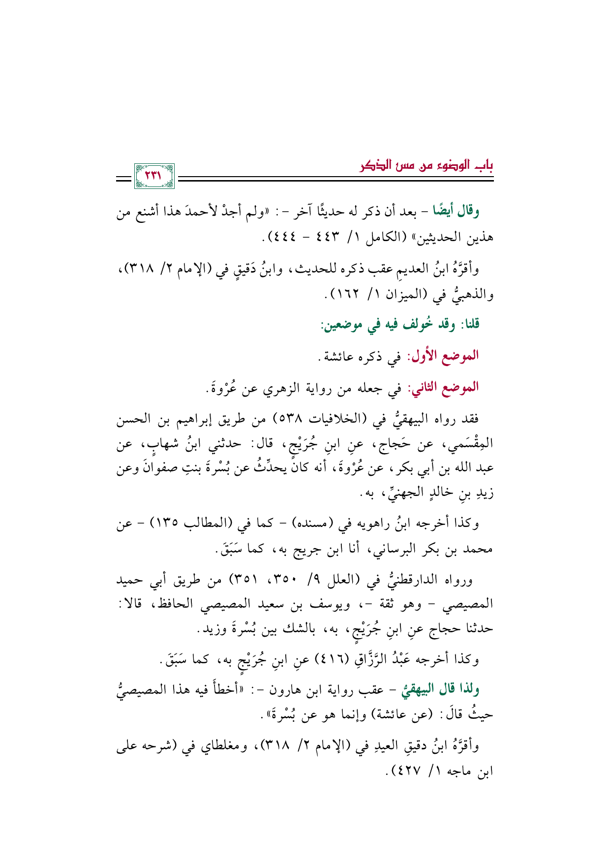 ولذا قال البيهقيُّ -عقب رواية ابن هارون-: ((أخطأَ فيه هذا المصيصيُّ حيثُ قالَ: (عن عائشة) وإنما هو عن بُسْرةَ)).