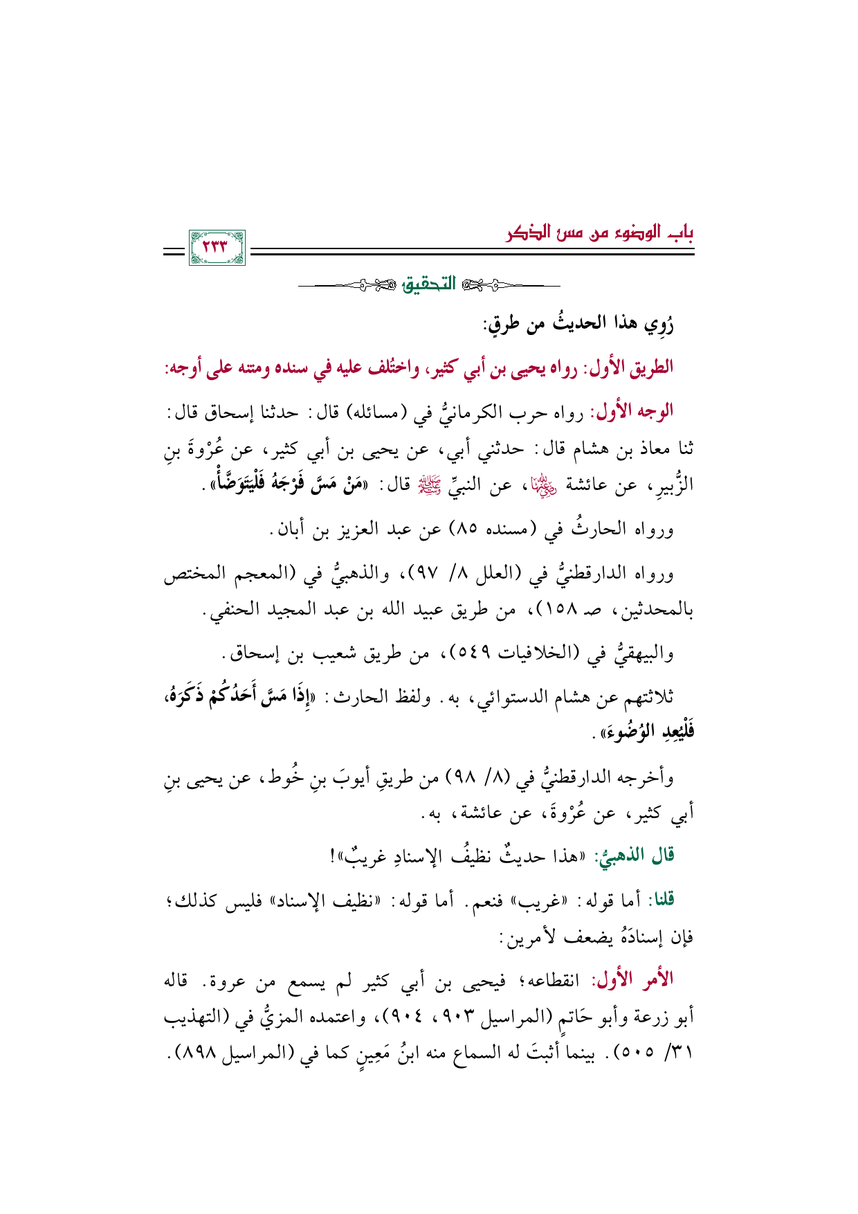 الوجه الأول: رواه حرب الكرمانيُّ في (مسائله) قال: حدثنا إسحاق قال: ثنا معاذ بن هشام قال: حدثني أبي، عن يحيى بن أبي كثير، عن عُرْوةَ بنِ الزُّبيرِ، عن عائشة رضي الله عنها، عن النبيِّ صلى الله عليه وسلم قال: ((مَنْ مَسَّ فَرْجَهُ فَلْيَتَوَضَّأْ)).