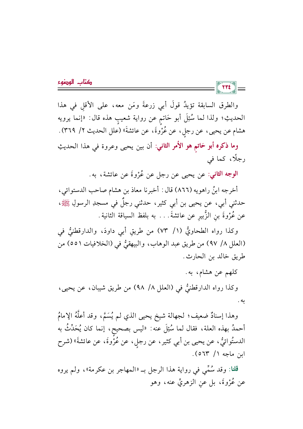 والطرق السابقة تؤيدُ قولَ أبي زرعةَ ومَن معه، على الأقلِ في هذا الحديثِ؛ ولذا لما سُئِلَ أبو حَاتمٍ عن رواية شعيبٍ هذه قال: ((إنما يرويه هشام عن يحيى، عن رجلٍ، عن عُرْوةَ، عن عائشةَ)) (علل الحديث ٢/ ٣٦٩).