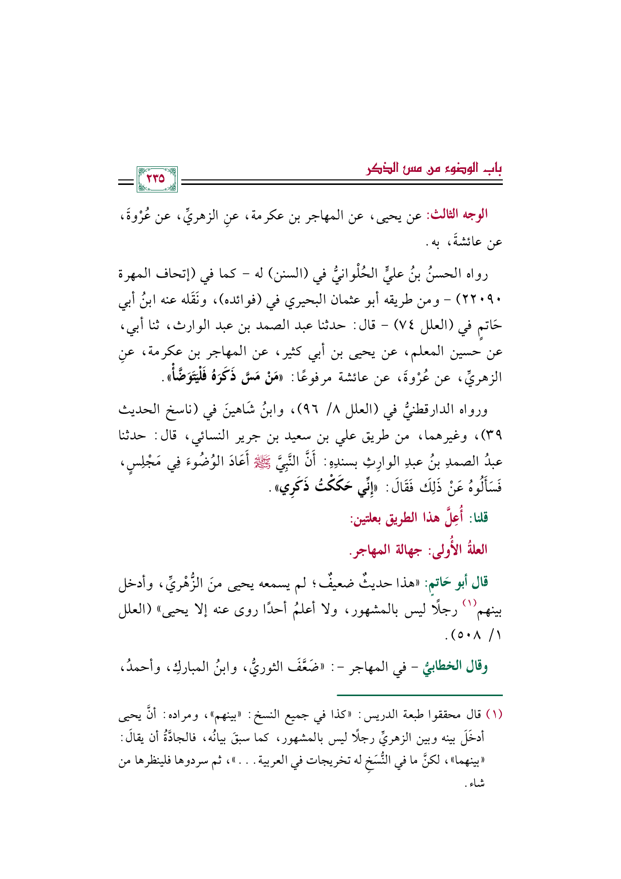 رواه الحسنُ بنُ عليٍّ الحُلْوانيُّ في (السنن) له -كما في (إتحاف المهرة ٢٢٠٩٠) -ومن طريقه أبو عثمان البحيري في (فوائده)، ونَقَله عنه ابنُ أبي حَاتمٍ في (العلل ٧٤) - قال: حدثنا عبد الصمد بن عبد الوارث، ثنا أبي، عن حسين المعلم، عن يحيى بن أبي كثير، عن المهاجر بن عكرمة، عنِ الزهريِّ، عن عُرْوةَ، عن عائشة مرفوعًا: ((مَنْ مَسَّ ذَكَرَهُ فَلْيَتَوَضَّأْ)).