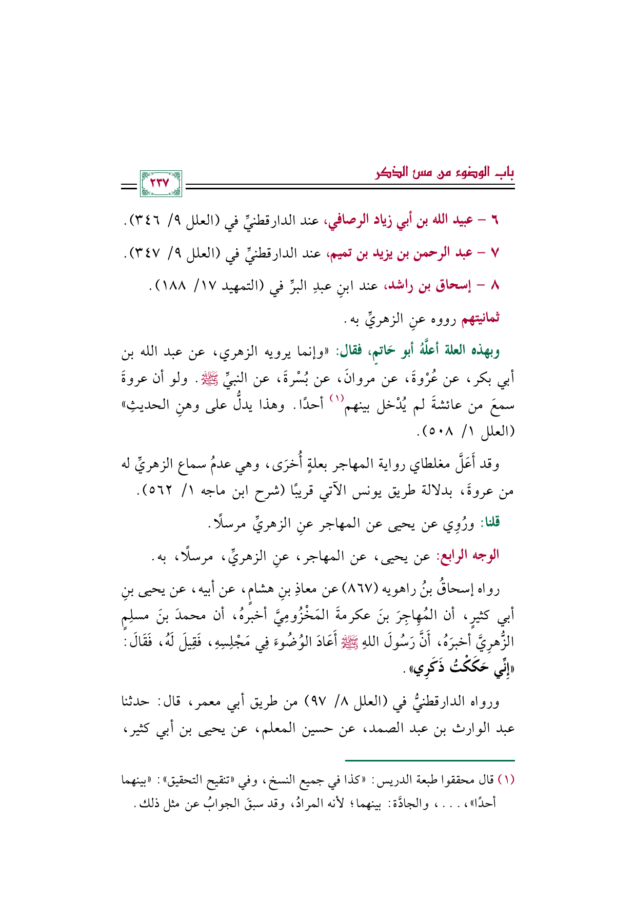 رواه إسحاقُ بنُ راهويه (٨٦٧) عن معاذِ بنِ هشامٍ، عن أبيه، عن يحيى بنِ أبي كثيرٍ، أن المُهِاجِرَ بنَ عكرمةَ المَخْزُومِيَّ أخبرهُ، أن محمدَ بنَ مسلِمٍ الزُّهرِيَّ أخبرَهُ، أَنَّ رَسُولَ اللهِ صلى الله عليه وسلم أَعَادَ الوُضُوءَ فِي مَجْلِسِهِ، فَقِيلَ لَهُ، فَقَالَ: ((إِنِّي حَكَكْتُ ذَكَرِي)).