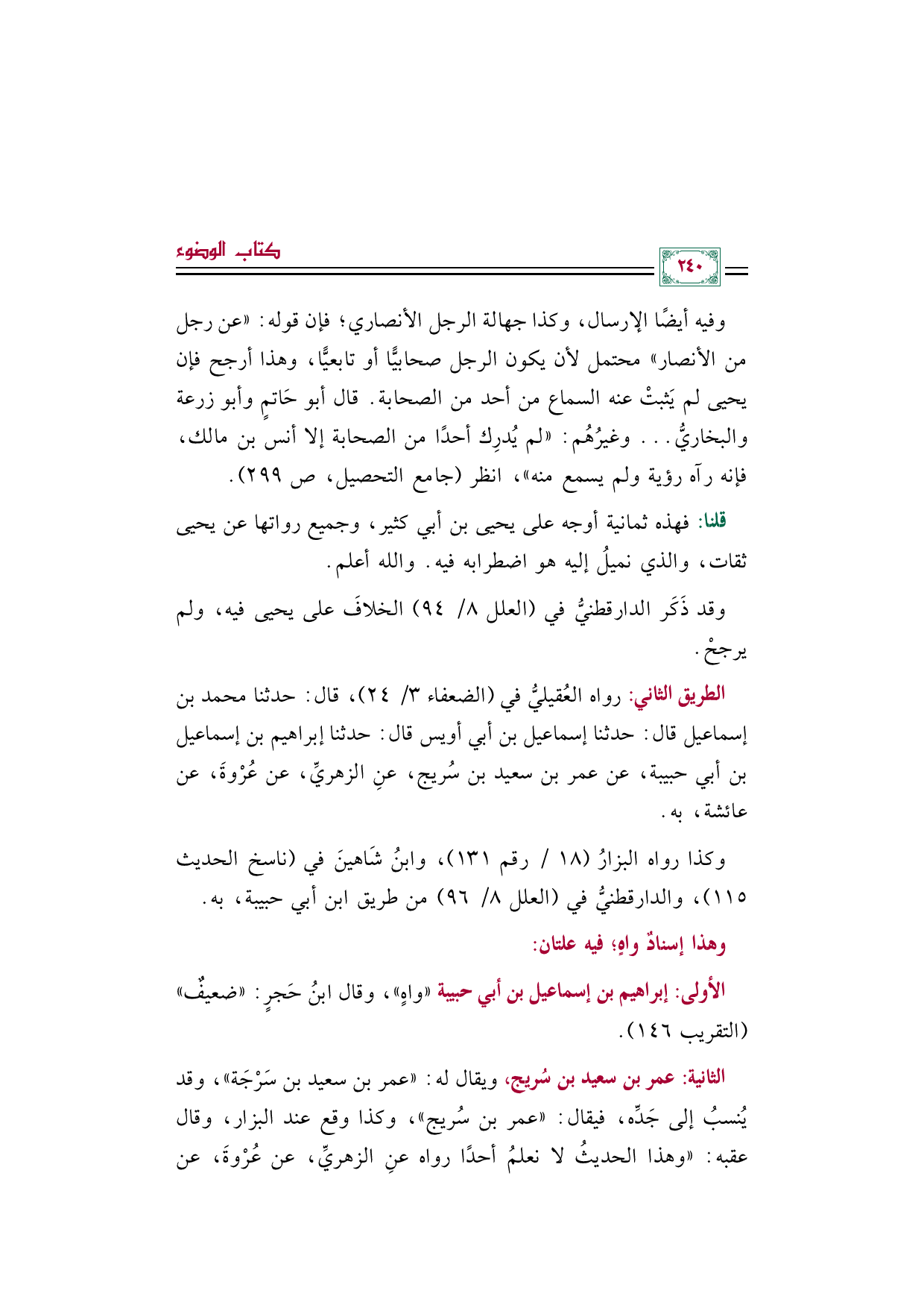 وفيه أيضًا الإرسال، وكذا جهالة الرجل الأنصاري؛ فإن قوله: ((عن رجل من الأنصار)) محتمل لأن يكون الرجل صحابيًّا أو تابعيًّا، وهذا أرجح فإن يحيى لم يَثبتْ عنه السماع من أحد من الصحابة. قال أبو حَاتمٍ وأبو زرعة والبخاريُّ ... وغيرُهُم: ((لم يُدرِك أحدًا من الصحابة إلا أنس بن مالك، فإنه رآه رؤية ولم يسمع منه))، انظر (جامع التحصيل، ص ٢٩٩).