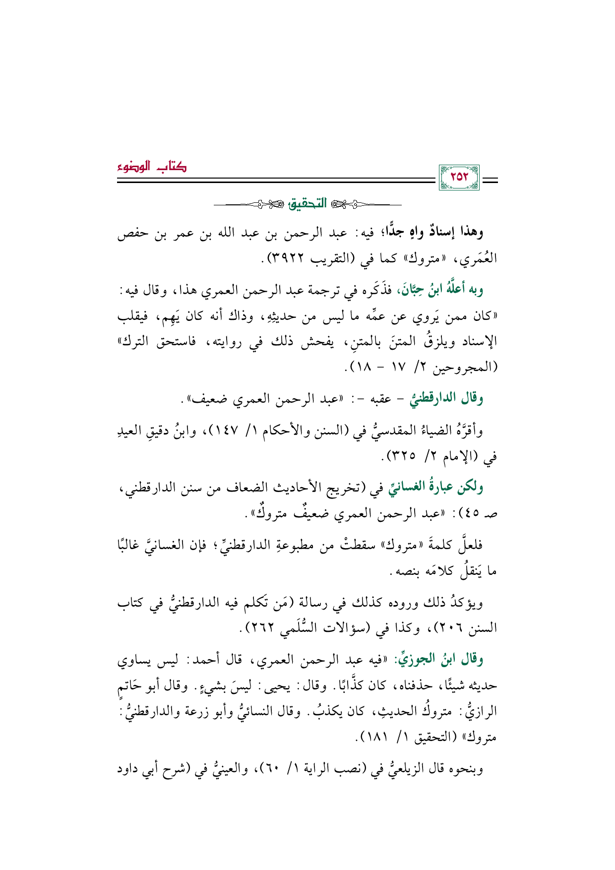 ولكن عبارةُ الغسانيِّ في (تخريج الأحاديث الضعاف من سنن الدارقطني، صـ ٤٥): ((عبد الرحمن العمري ضعيفٌ متروكٌ)).