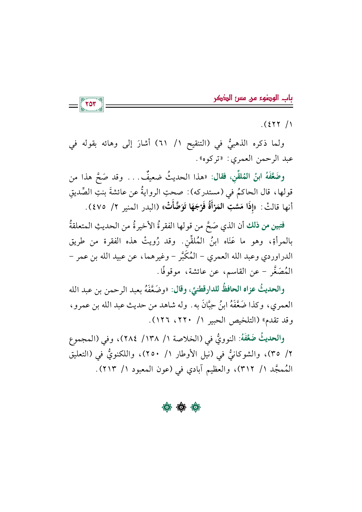 وضَعَّفَهُ ابنُ المُلقِّنِ، فقال: ((هذا الحديثُ ضعيفٌ ... وقد صَحَّ هذا من قولها، قال الحاكمُ في (مستدركه): صحتِ الروايةُ عن عائشةَ بنتِ الصِّديقِ أنها قالتْ: ((إِذَا مَسَّتِ المَرْأَةُ فَرْجَهَا تَوَضَّأَتْ)) (البدر المنير ٢/ ٤٧٥).