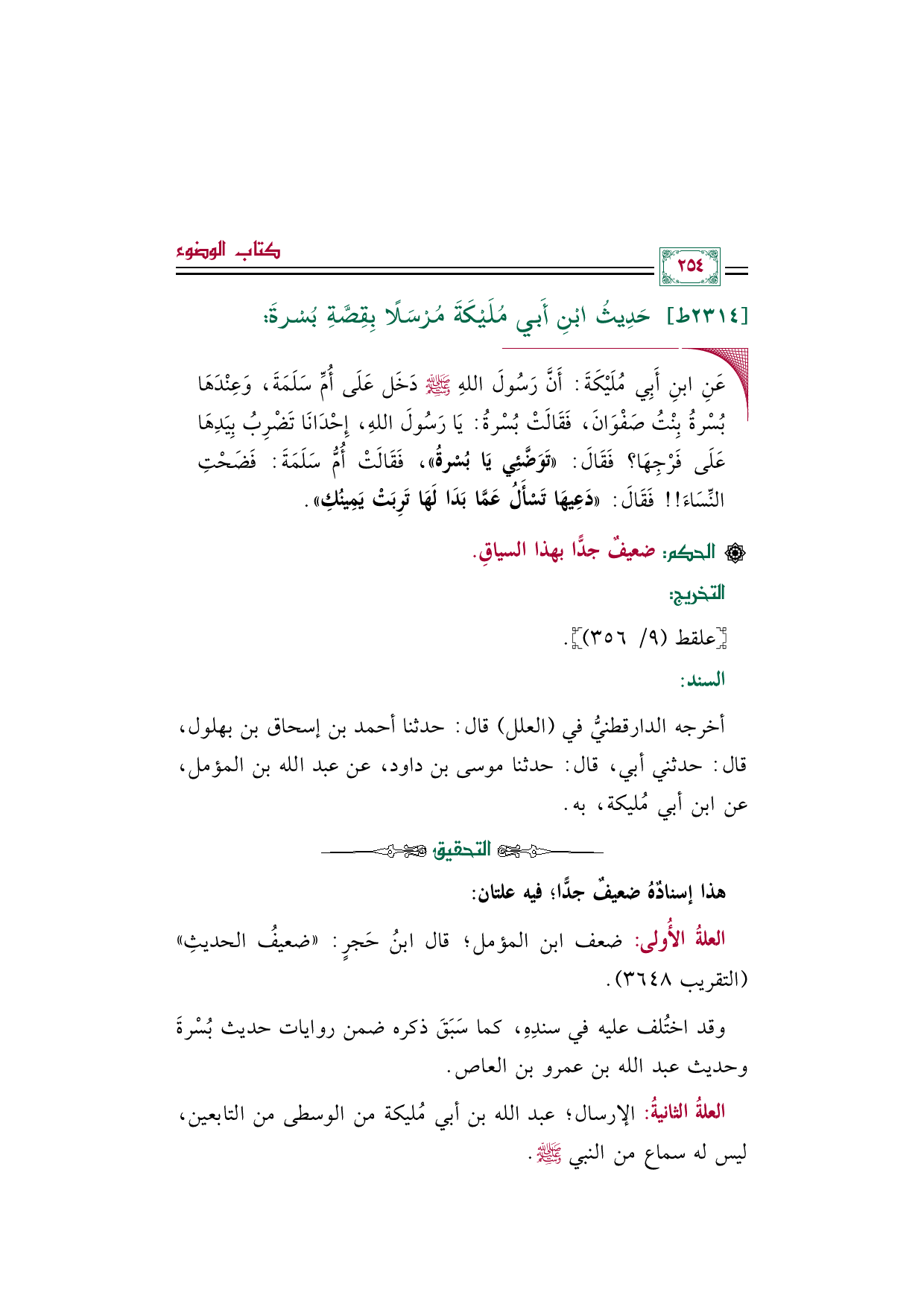أخرجه الدارقطنيُّ في (العلل) قال: حدثنا أحمد بن إسحاق بن بهلول، قال: حدثني أبي، قال: حدثنا موسى بن داود، عن عبد الله بن المؤمل، عن ابن أبي مُليكة، به.
