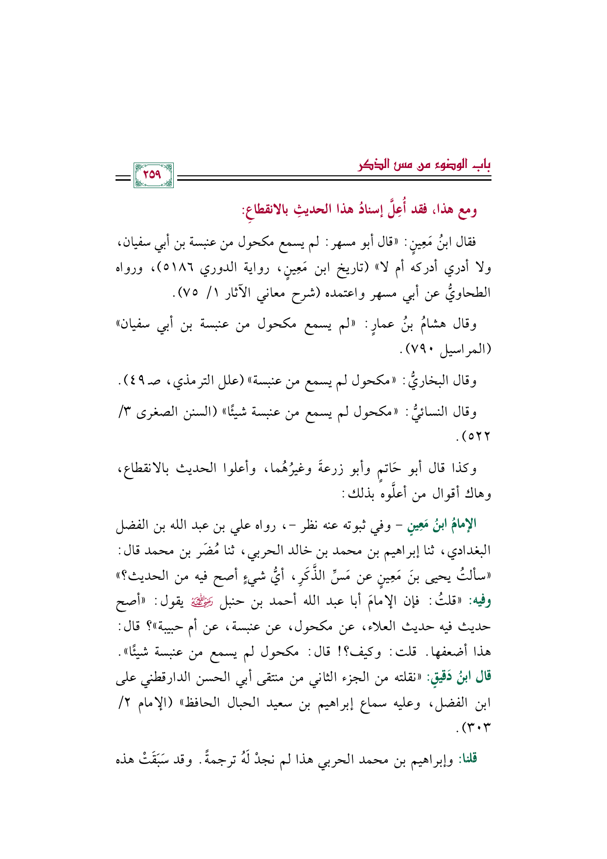 - الإمامُ ابنُ مَعِينٍ -وفي ثبوته عنه نظر-، رواه علي بن عبد الله بن الفضل البغدادي، ثنا إبراهيم بن محمد بن خالد الحربي، ثنا مُضَر بن محمد قال: ((سألتُ يحيى بنَ مَعِينٍ عن مَسِّ الذَّكَرِ، أيُّ شيءٍ أصح فيه من الحديث؟ )) وفيه: ((قلتُ: فإن الإمامَ أبا عبد الله أحمد بن حنبل رضي الله عنه يقول: ((أصح حديث فيه حديث العلاء، عن مكحول، عن عنبسة، عن أم حبيبة))؟ قال: هذا أضعفها. قلت: وكيف؟ ! قال: مكحول لم يسمع من عنبسة شيئًا)). قال ابنُ دَقيقٍ: ((نقلته من الجزء الثاني من منتقى أبي الحسن الدارقطني على ابن الفضل، وعليه سماع إبراهيم بن سعيد الحبال الحافظ)) (الإمام ٢/ ٣٠٣).