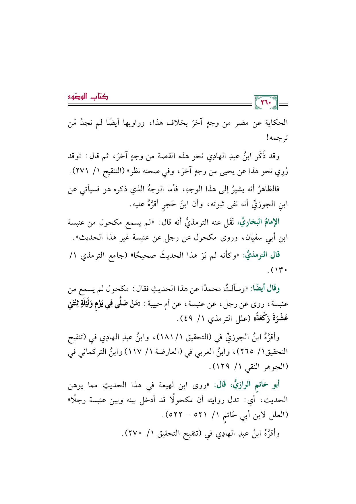 وقال أيضًا: ((وسألتُ محمدًا عن هذا الحديثِ فقال: مكحول لم يسمع من عنبسة، روى عن رجل، عن عنبسة، عن أم حبيبة: ((مَنْ صَلَّى فِي يَوْمٍ وَلَيْلَةٍ ثِنْتَيْ عَشْرَةَ رَكْعَةً)) (علل الترمذي ١/ ٤٩).