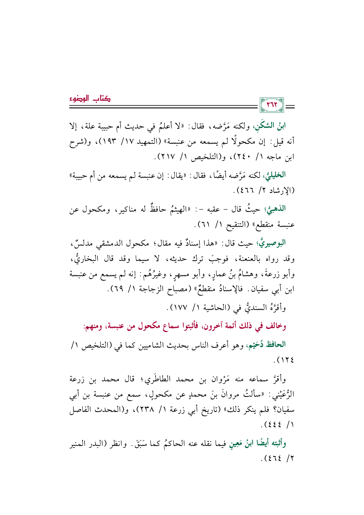 - ابنُ السَّكَنِ، ولكنه مَرَّضه، فقال: ((لا أعلمُ في حديث أم حبيبة علة، إلا أنه قيل: إن مكحولًا لم يسمعه من عنبسة)) (التمهيد ١٧/ ١٩٣)، و (شرح ابن ماجه ١/ ٢٤٠)، و (التلخيص ١/ ٢١٧).