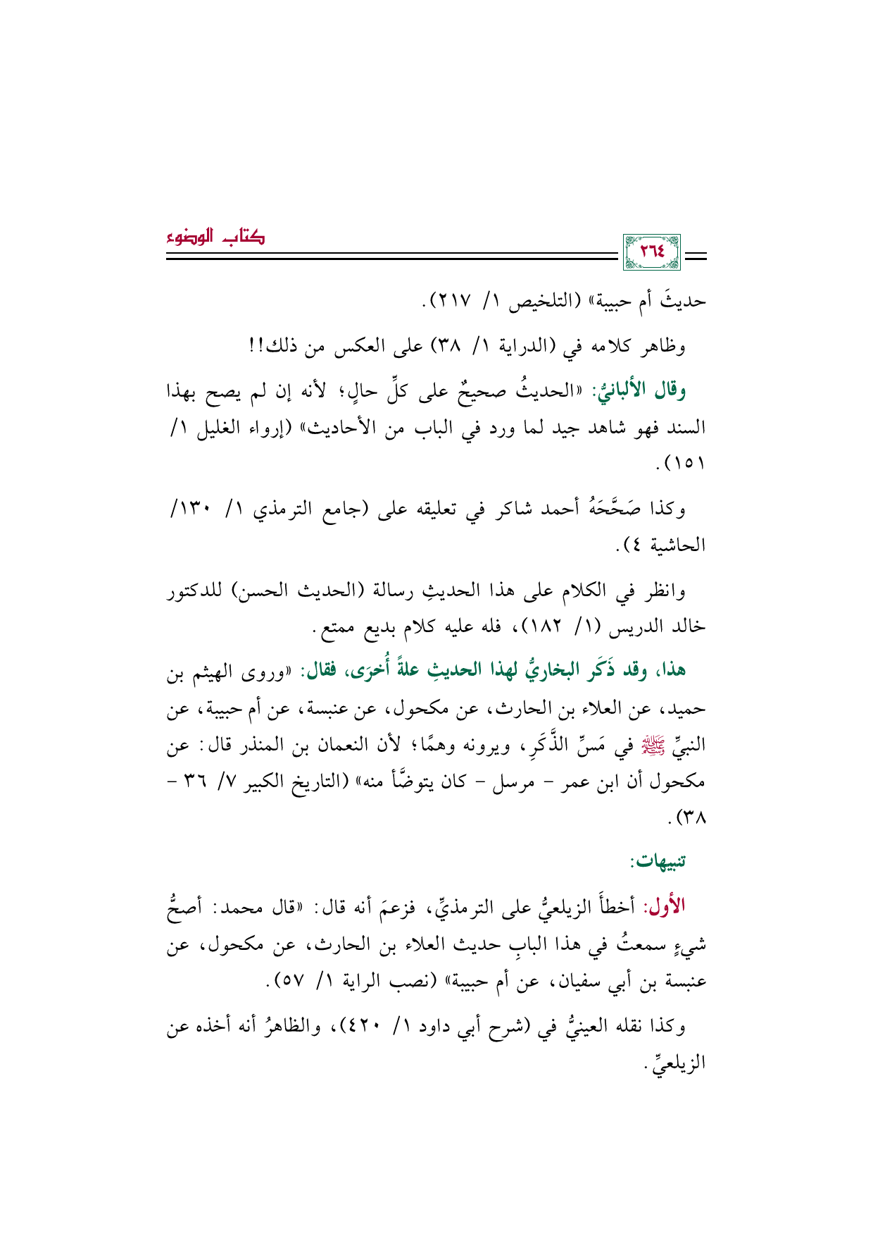 الأول: أخطأَ الزيلعيُّ على الترمذيِّ، فزعمَ أنه قال: ((قال محمد: أصحُّ شيءٍ سمعتُ في هذا البابِ حديث العلاء بن الحارث، عن مكحول، عن عنبسة بن أبي سفيان، عن أم حبيبة)) (نصب الراية ١/ ٥٧).