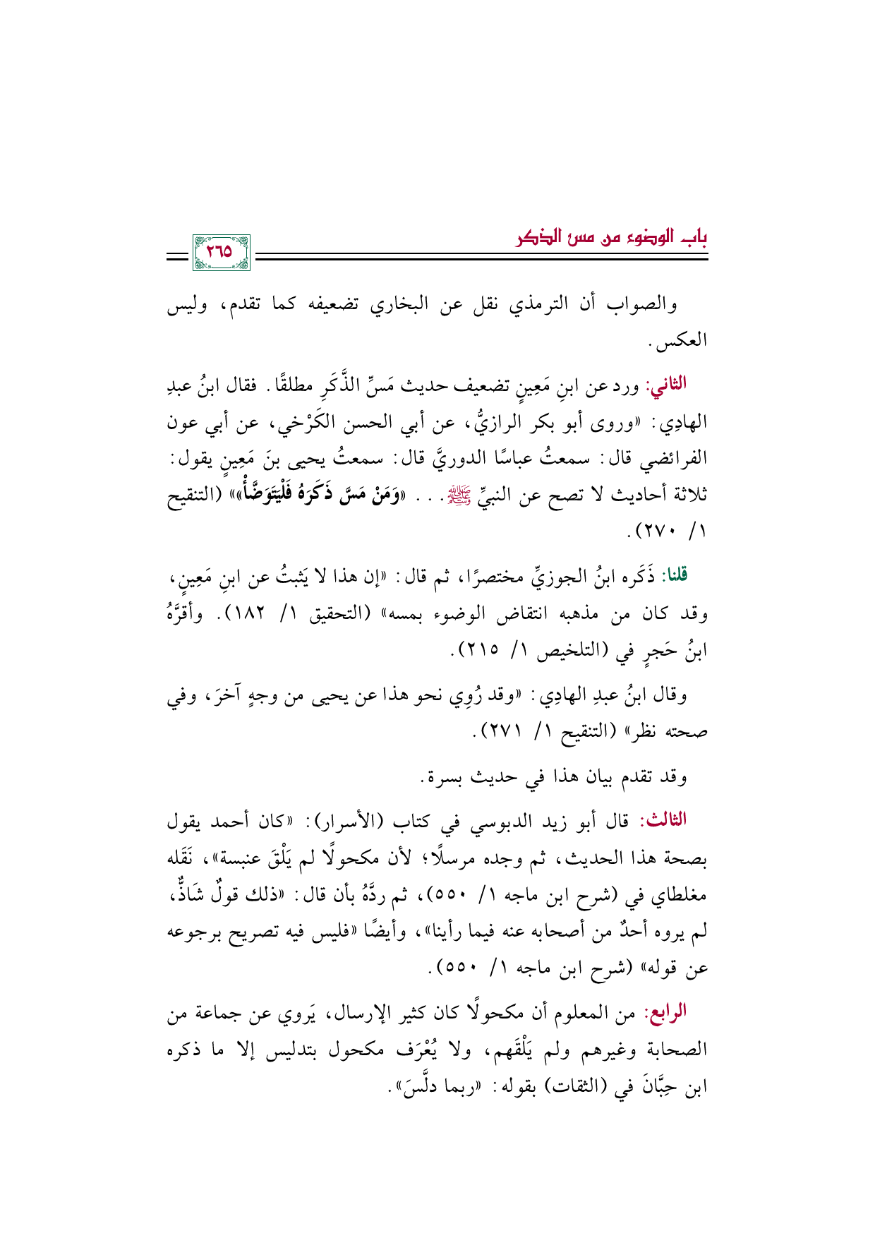 الثاني: ورد عن ابنِ مَعِينٍ تضعيف حديث مَسِّ الذَّكَرِ مطلقًا. فقال ابنُ عبدِ الهادِي: ((وروى أبو بكر الرازيُّ، عن أبي الحسن الكَرْخي، عن أبي عون الفرائضي قال: سمعتُ عباسًا الدوريَّ قال: سمعتُ يحيى بنَ مَعِينٍ يقول: ثلاثة أحاديث لا تصح عن النبيِّ صلى الله عليه وسلم ... ((وَمَنْ مَسَّ ذَكَرَهُ فَلْيَتَوَضَّأْ)))) (التنقيح ١/ ٢٧٠).