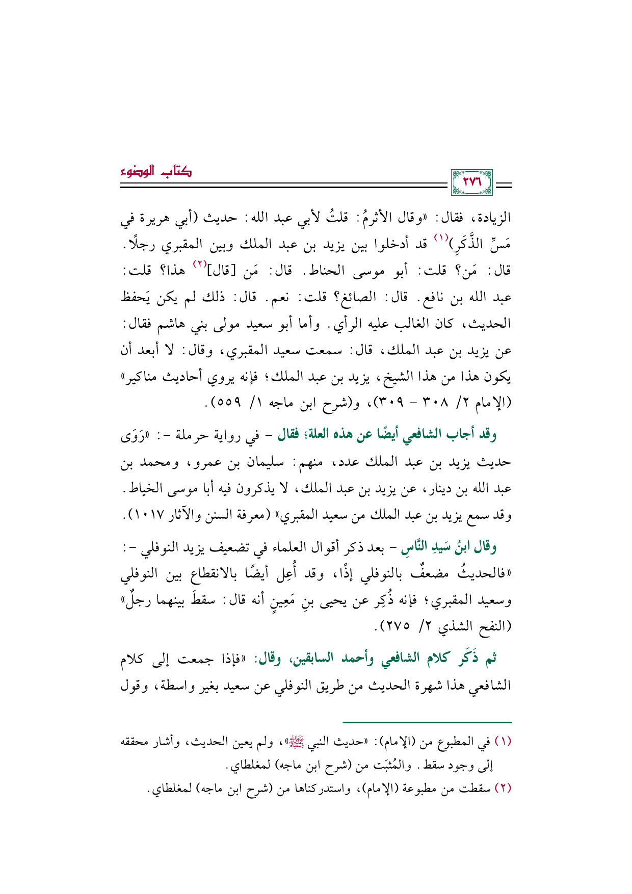 الزيادة، فقال: ((وقال الأثرمُ: قلتُ لأبي عبد الله: حديث (أبي هريرة في مَسِّ الذَّكَرِ) (¬١) قد أدخلوا بين يزيد بن عبد الملك وبين المقبري رجلًا. قال: مَن؟ قلت: أبو موسى الحناط. قال: مَن [قال] (¬٢) هذا؟ قلت: عبد الله بن نافع. قال: الصائغ؟ قلت: نعم. قال: ذلك لم يكن يَحفظ الحديث، كان الغالب عليه الرأي. وأما أبو سعيد مولى بني هاشم فقال: عن يزيد بن عبد الملك، قال: سمعت سعيد المقبري، وقال: لا أبعد أن يكون هذا من هذا الشيخ، يزيد بن عبد الملك؛ فإنه يروي أحاديث مناكير)) (الإمام ٢/ ٣٠٨ - ٣٠٩)، و (شرح ابن ماجه ١/ ٥٥٩).