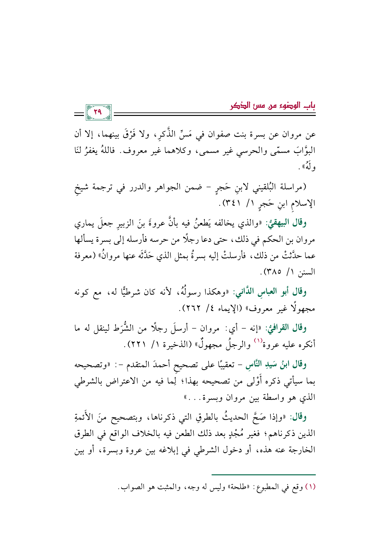 وقال البيهقيُّ: ((والذي يخالفه يَطعنُ فيه بأنَّ عروةَ بنَ الزبيرِ جعلَ يماري مروان بن الحكم في ذلك، حتى دعا رجلًا من حرسه فأرسله إلى بسرة يسألها عما حدَّثتْ من ذلك، فأرسلتْ إليه بسرةُ بمثل الذي حَدَّثَه عنها مروانُ)) (معرفة السنن ١/ ٣٨٥).