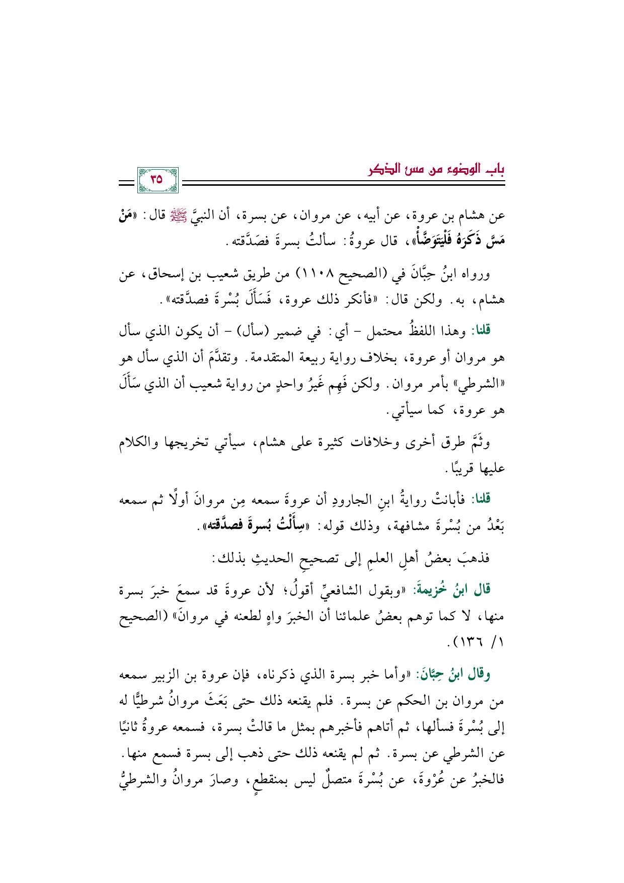 وقال ابنُ حِبَّانَ: ((وأما خبر بسرة الذي ذكرناه، فإن عروة بن الزبير سمعه من مروان بن الحكم عن بسرة. فلم يقنعه ذلك حتى بَعَثَ مروانُ شرطيًّا له إلى بُسْرةَ فسألها، ثم أتاهم فأخبرهم بمثل ما قالتْ بسرة، فسمعه عروةُ ثانيًا عن الشرطي عن بسرة. ثم لم يقنعه ذلك حتى ذهب إلى بسرة فسمع منها. فالخبرُ عن عُرْوةَ، عن بُسْرةَ متصلٌ ليس بمنقطعٍ، وصارَ مروانُ والشرطيُّ