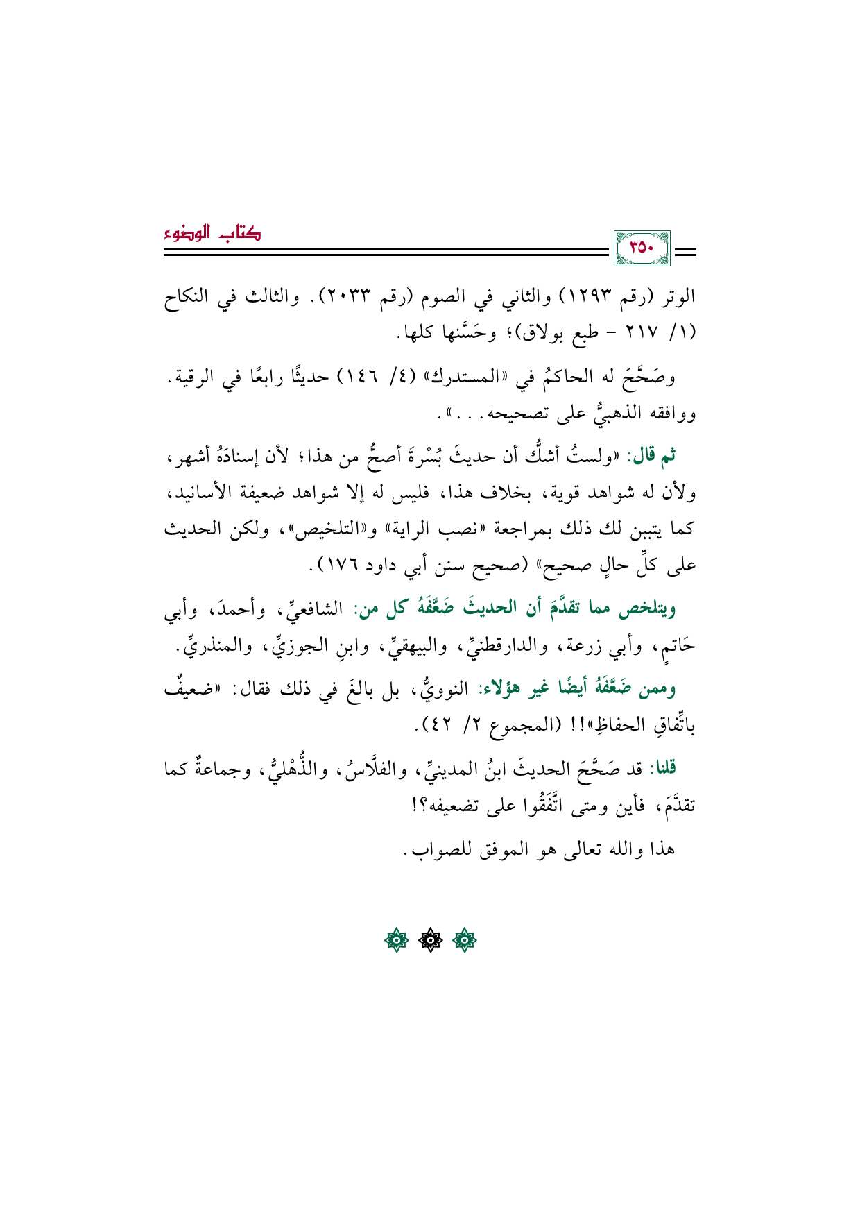 ثم قال: ((ولستُ أشكُّ أن حديثَ بُسْرةَ أصحُّ من هذا؛ لأن إسنادَهُ أشهر، ولأن له شواهد قوية، بخلاف هذا، فليس له إلا شواهد ضعيفة الأسانيد، كما يتببن لك ذلك بمراجعة ((نصب الراية)) و ((التلخيص))، ولكن الحديث على كلِّ حالٍ صحيح)) (صحيح سنن أبي داود ١٧٦).