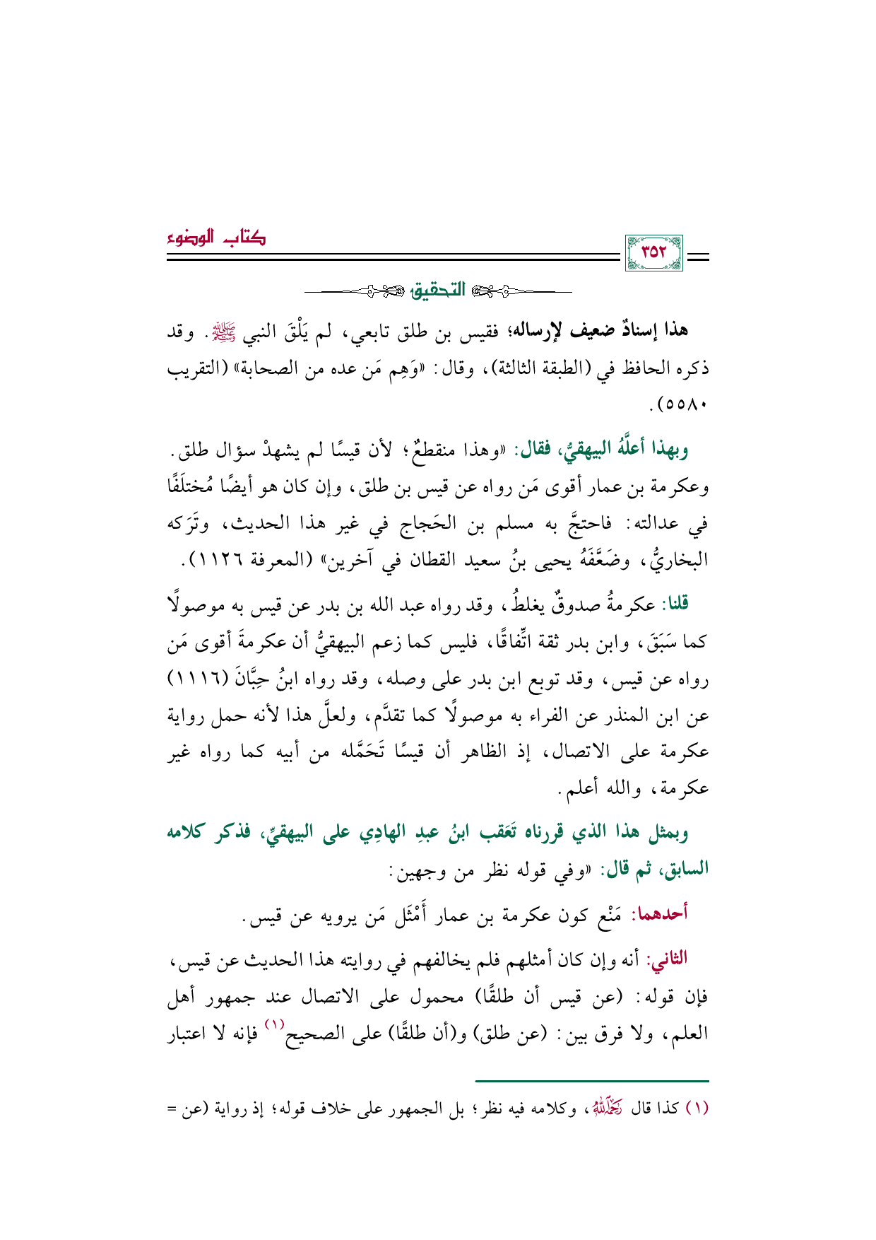 (¬١) كذا قال رحمه الله، وكلامه فيه نظر؛ بل الجمهور على خلاف قوله؛ إذ رواية (عن طلق) تدلُّ على تحمله ذلك من أبيه، بينما رواية (أن طلقًا سأل النبي صلى الله عليه وسلم) لا تدلُّ على ذلك مطلقًا، بل هي مرسلة، حيث إن قيسًا يحكي واقعة في زمن النبي صلى الله عليه وسلم لم يشهدها ولم يدركها، ولكن لو قال (أن طلقًا قال: سألت ... ) لاختلف الأمر، حيث يكون طلق هو راوي الخبر وليس قيسًا، فحينئذٍ يتنزل كلام ابن عبد الهادي الذي نقله عن الجمهور بأنه لا فرق بين (عن) و (أنَّ).