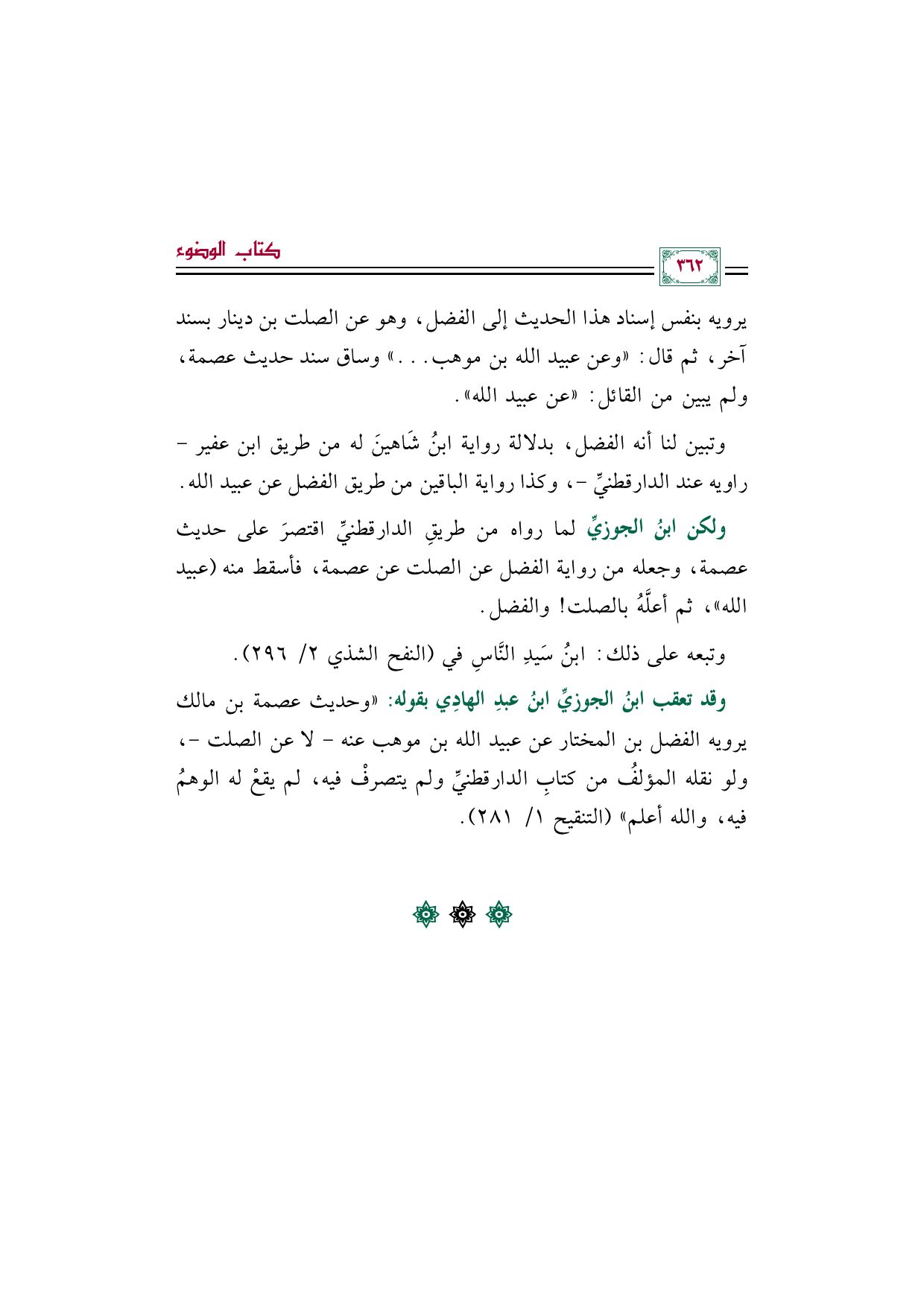 وقد تعقب ابنُ الجوزيِّ ابنُ عبدِ الهادِي بقوله: ((وحديث عصمة بن مالك يرويه الفضل بن المختار عن عبيد الله بن موهب عنه -لا عن الصلت-، ولو نقله المؤلفُ من كتابِ الدارقطنيِّ ولم يتصرفْ فيه، لم يقعْ له الوهمُ فيه، والله أعلم)) (التنقيح ١/ ٢٨١).