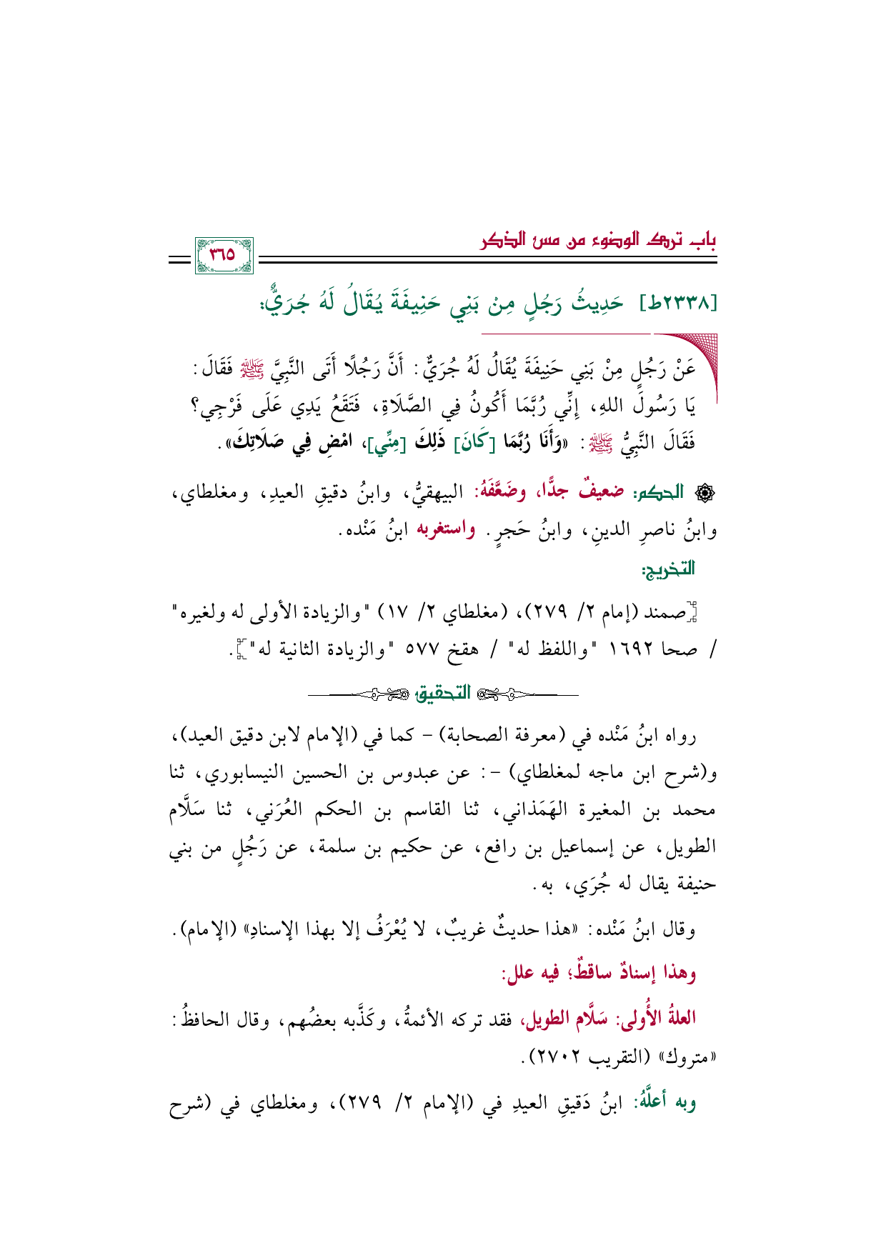 رواه ابنُ مَنْده في (معرفة الصحابة) -كما في (الإمام لابن دقيق العيد)، و (شرح ابن ماجه لمغلطاي) -: عن عبدوس بن الحسين النيسابوري، ثنا محمد بن المغيرة الهَمَذاني، ثنا القاسم بن الحكم العُرَني، ثنا سَلَّام الطويل، عن إسماعيل بن رافع، عن حكيم بن سلمة، عن رَجُلٍ من بني حنيفة يقال له جُرَي، به.