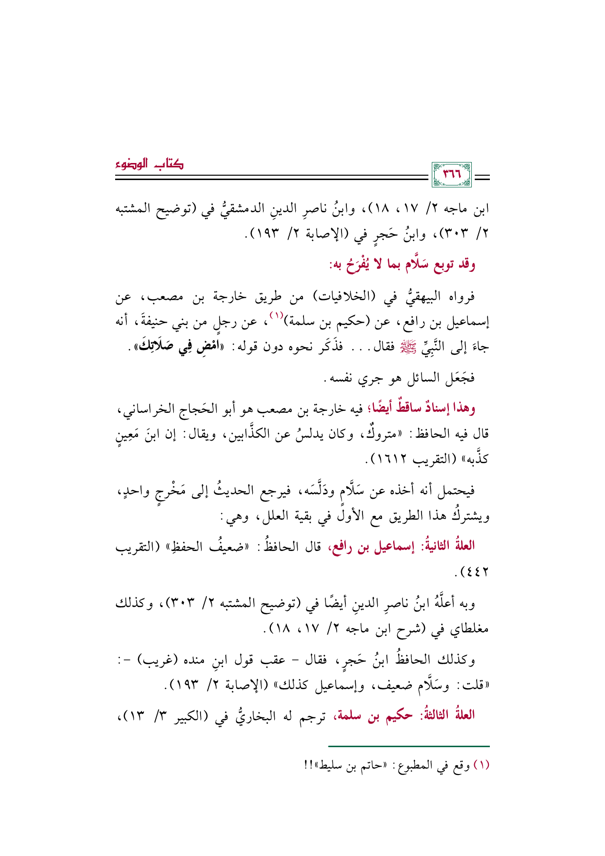 العلةُ الثالثةُ: حكيم بن سلمة، ترجم له البخاريُّ في (الكبير ٣/ ١٣)،