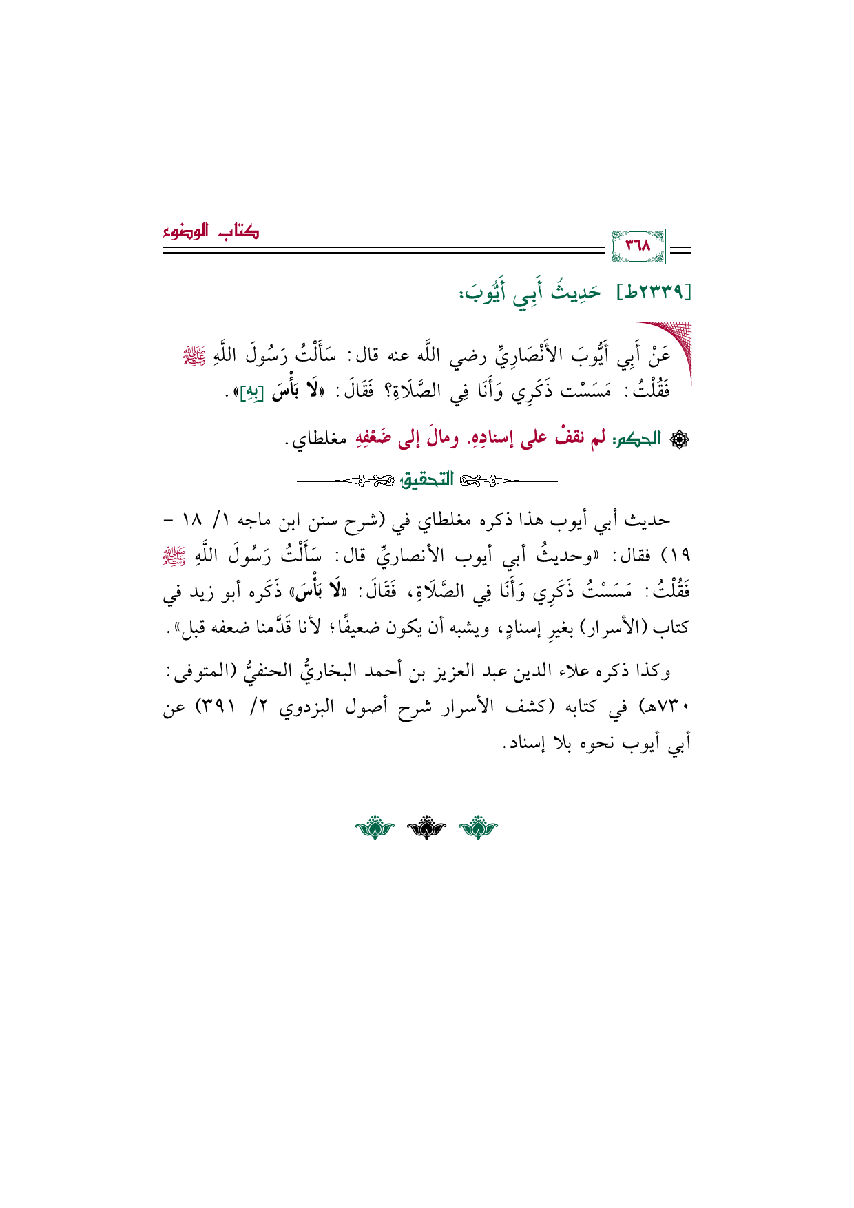 حديث أبي أيوب هذا ذكره مغلطاي في (شرح سنن ابن ماجه ١/ ١٨ - ١٩) فقال: ((وحديثُ أبي أيوب الأنصاريِّ قال: سَأَلْتُ رَسُولَ اللَّهِ صلى الله عليه وسلم فَقُلْتُ: مَسَسْتُ ذَكَرِي وَأَنَا فِي الصَّلَاةِ، فَقَالَ: ((لَا بَأْسَ)) ذَكَره أبو زيد في كتاب (الأسرار) بغيرِ إسنادٍ، ويشبه أن يكون ضعيفًا؛ لأنا قَدَّمنا ضعفه قبل)).
