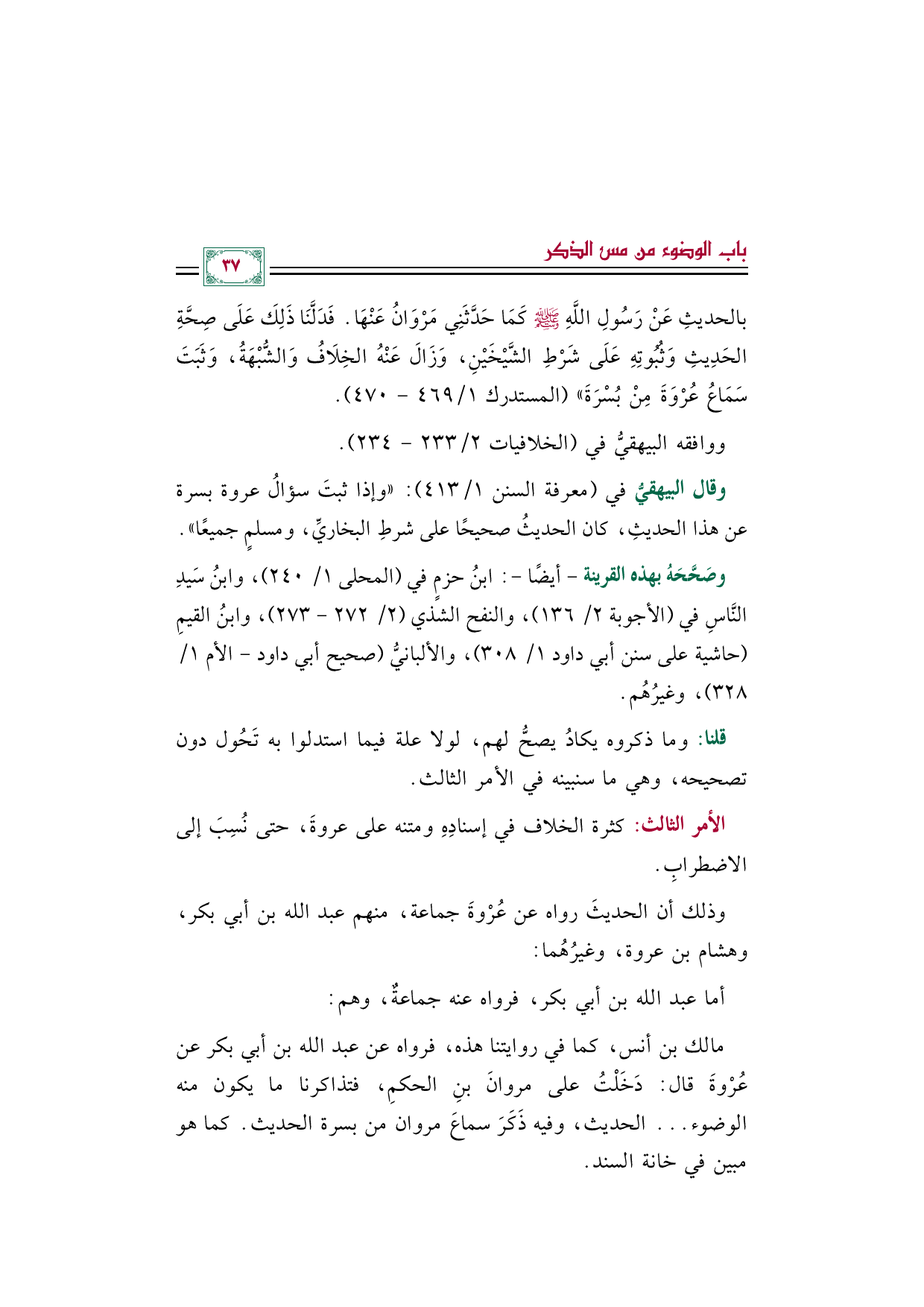 وقال البيهقيُّ في (معرفة السنن ١/ ٤١٣): ((وإذا ثبتَ سؤالُ عروة بسرة عن هذا الحديثِ، كان الحديثُ صحيحًا على شرطِ البخاريِّ، ومسلمٍ جميعًا)).