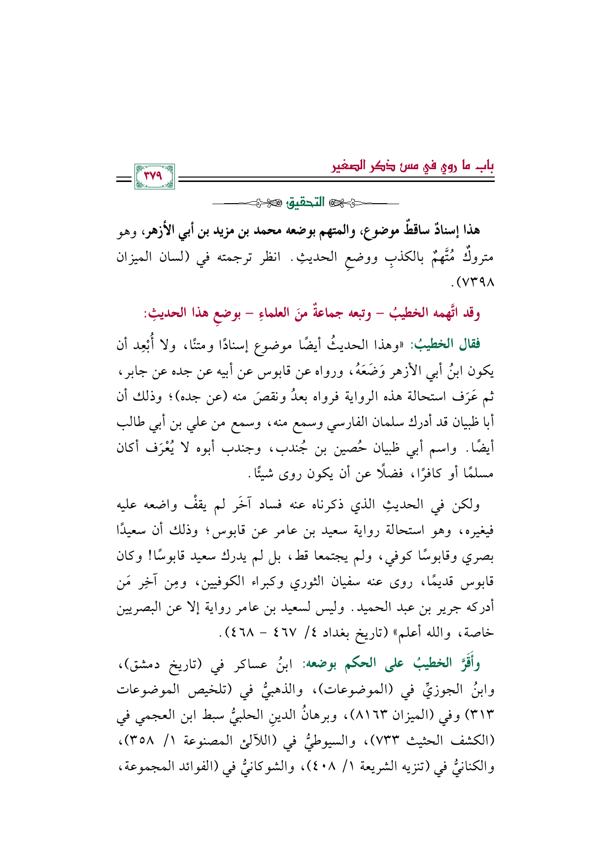 فقال الخطيبُ: ((وهذا الحديثُ أيضًا موضوع إسنادًا ومتنًا، ولا أُبْعِد أن يكون ابنُ أبي الأزهر وَضَعَهُ، ورواه عن قابوس عن أبيه عن جده عن جابر، ثم عَرَف استحالة هذه الرواية فرواه بعدُ ونقصَ منه (عن جده)؛ وذلك أن أبا ظبيان قد أدرك سلمان الفارسي وسمع منه، وسمع من علي بن أبي طالب أيضًا. واسم أبي ظبيان حُصين بن جُندب، وجندب أبوه لا يُعْرَف أكان مسلمًا أو كافرًا، فضلًا عن أن يكون روى شيئًا.
